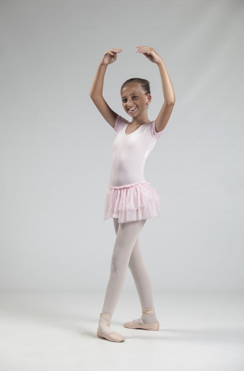 Body semplice reso più grazioso dalla presenza del gonnellino. Il gonnellino molto corto permette all’insegnante di osservare tutti i movimenti dell’allieva. E’ adatto alle ragazze di età più giovane.