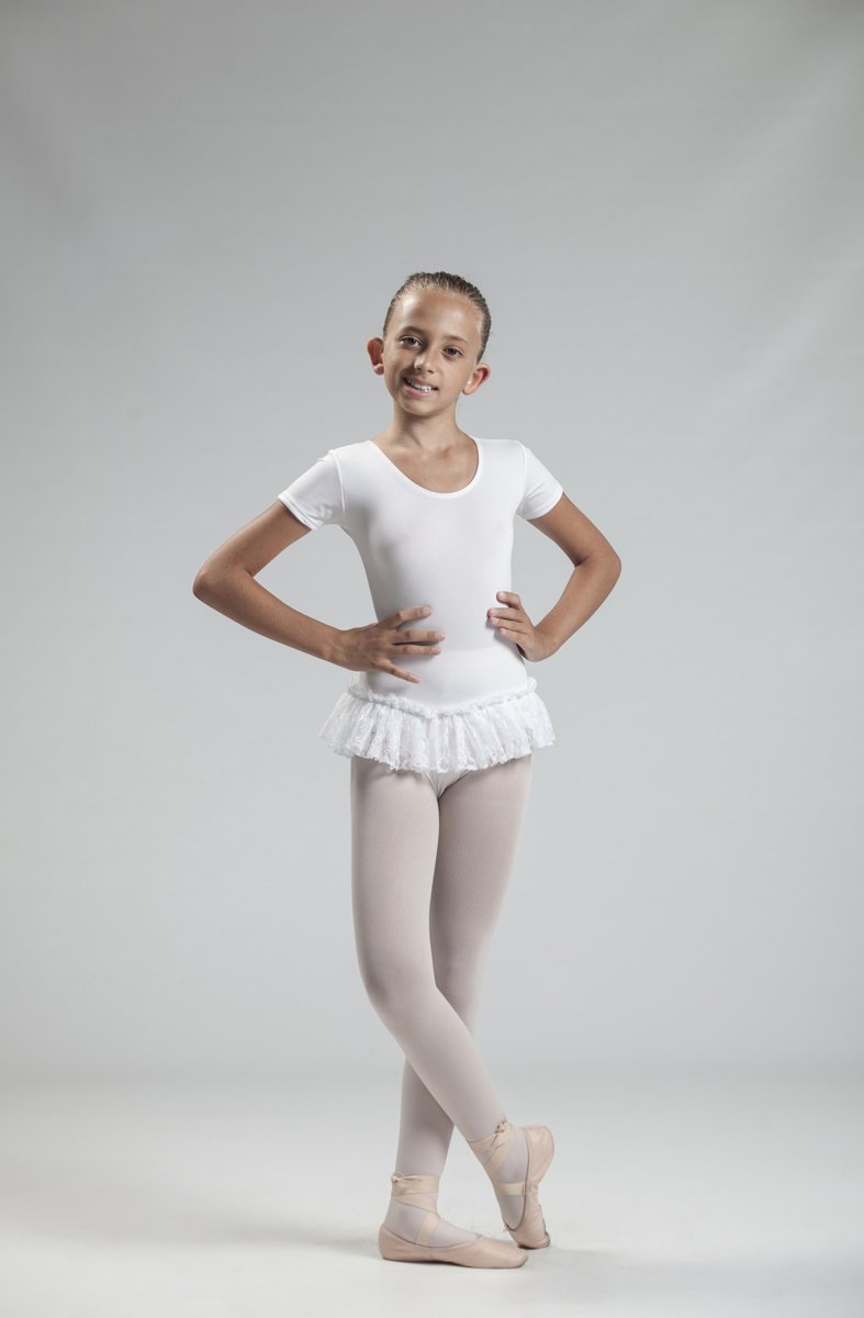 Body semplice impreziosito dalla presenza del gonnellino di merletto che conferisce particolare eleganza al capo. Il gonnellino molto corto permette all’insegnante di osservare tutti i movimenti dell’allieva. E’ adatto alle ragazze di età più giovane.