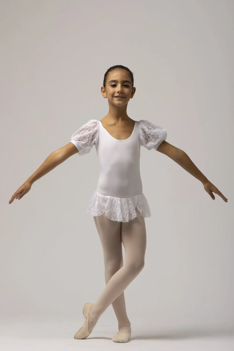 Body semplice impreziosito dalla presenza del gonnellino di merletto che conferisce particolare eleganza al capo. Il gonnellino molto corto permette all’insegnante di osservare tutti i movimenti dell’allieva. E’ adatto alle ragazze di età più giovane.