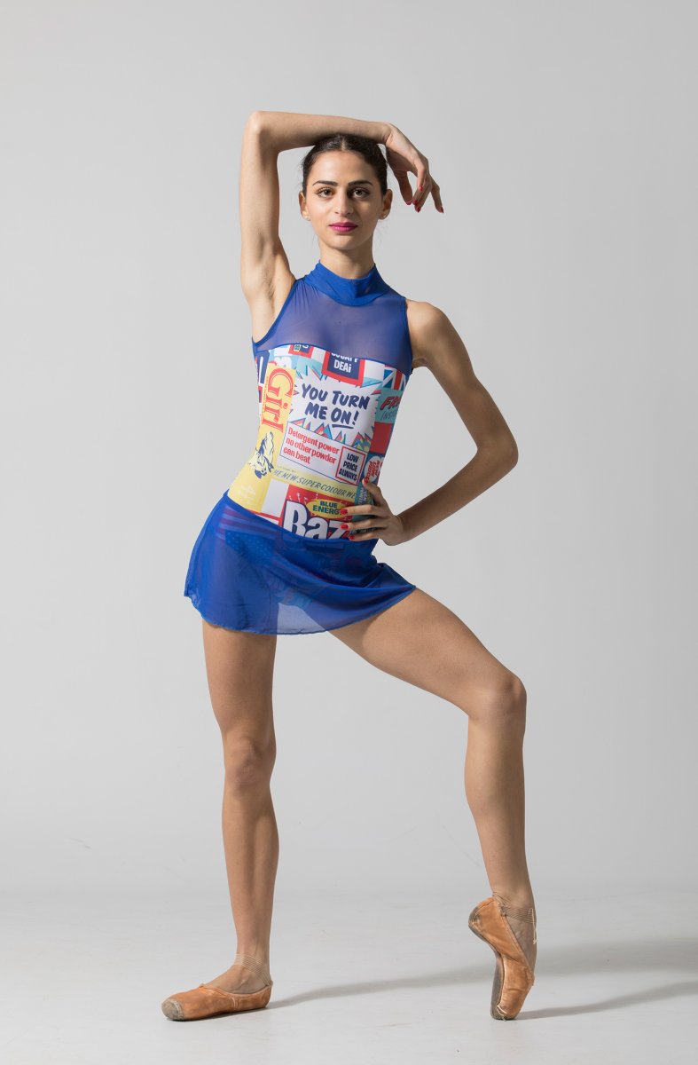 La scollatura è all’americana e lascia le spalle scoperte. La gonna di rete asseconda tutti i movimenti