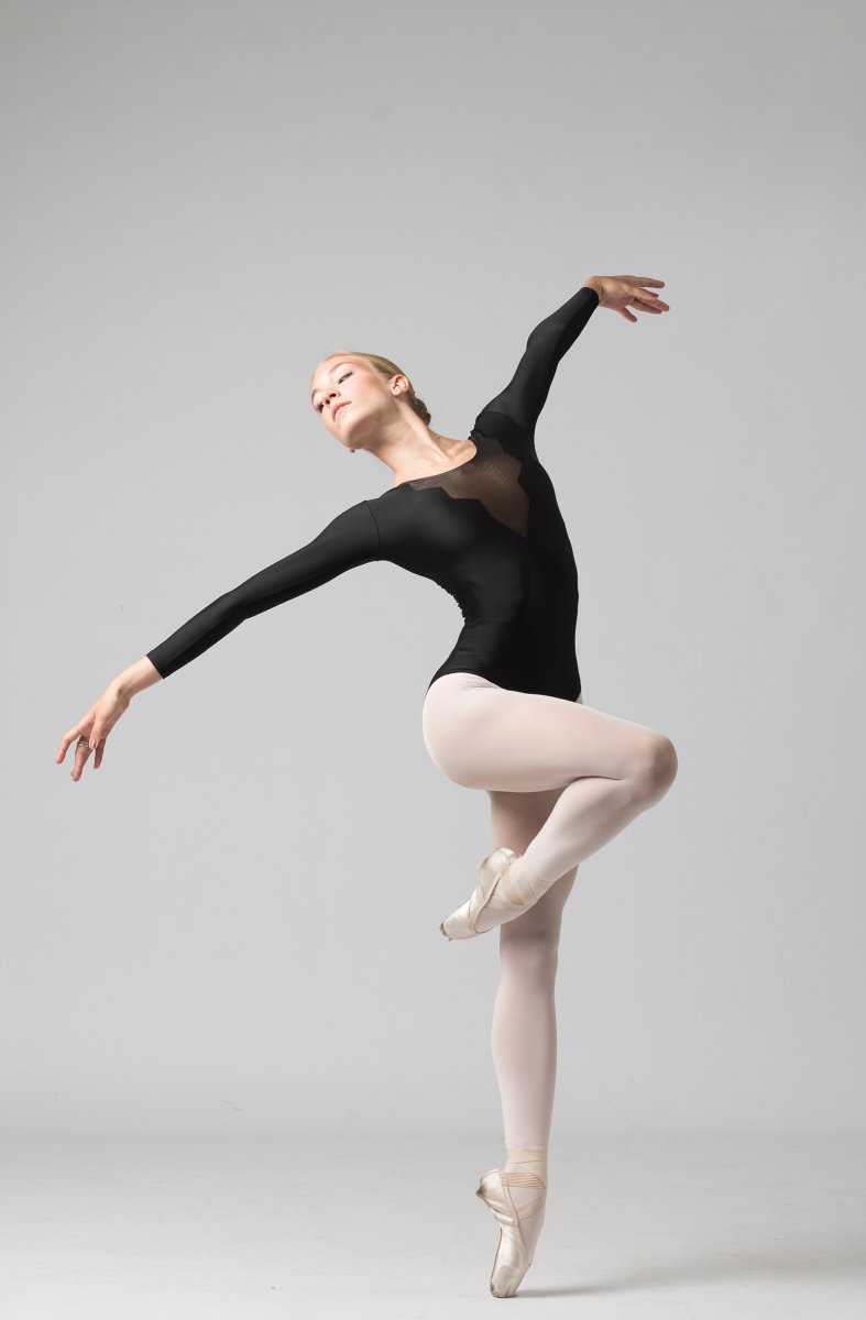 L’inedita forma delle fasce dietro la schiena, oltre ad avere una funzione estetica, permette di fr aderire bene il body al corpo delle ballerine.