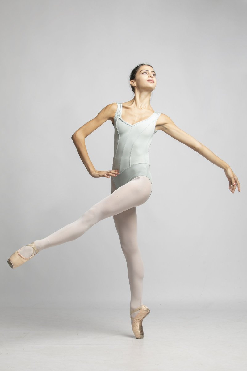 L’inedita forma delle fasce dietro la schiena, oltre ad avere una funzione estetica, permette di fr aderire bene il body al corpo delle ballerine.