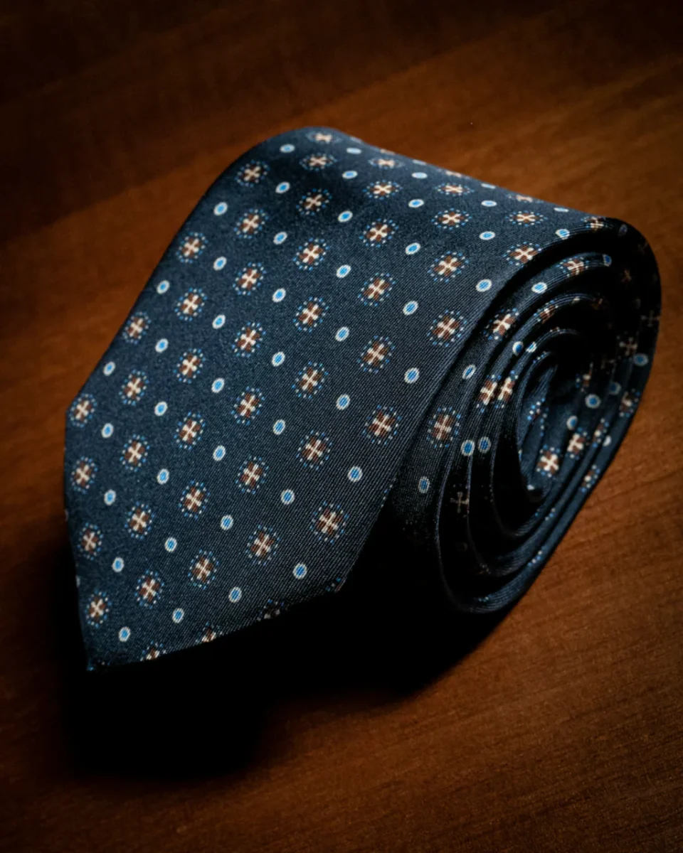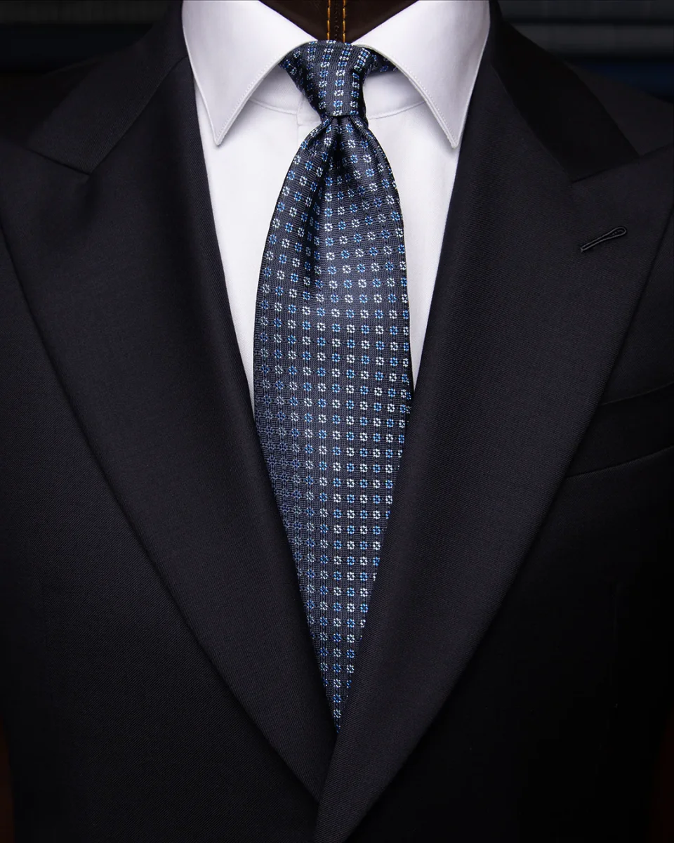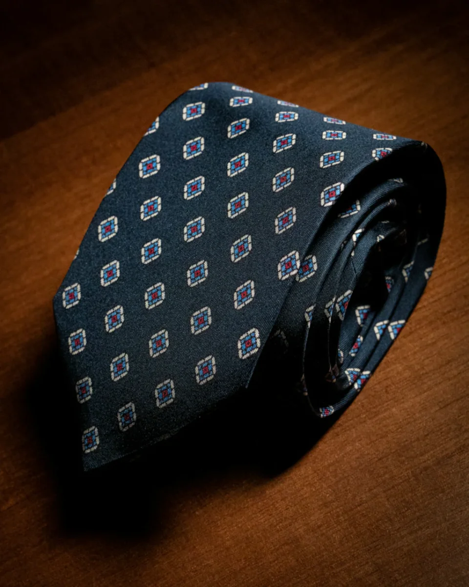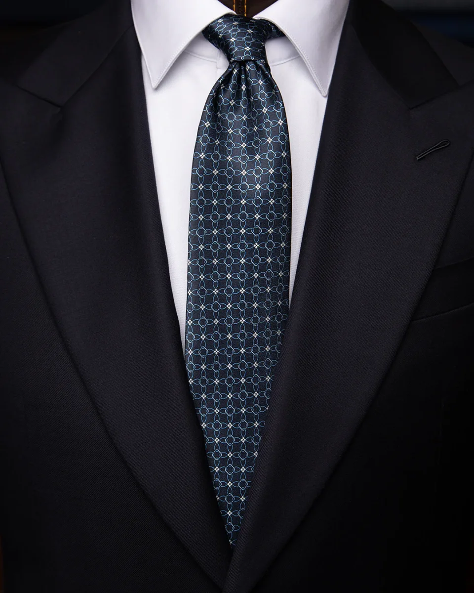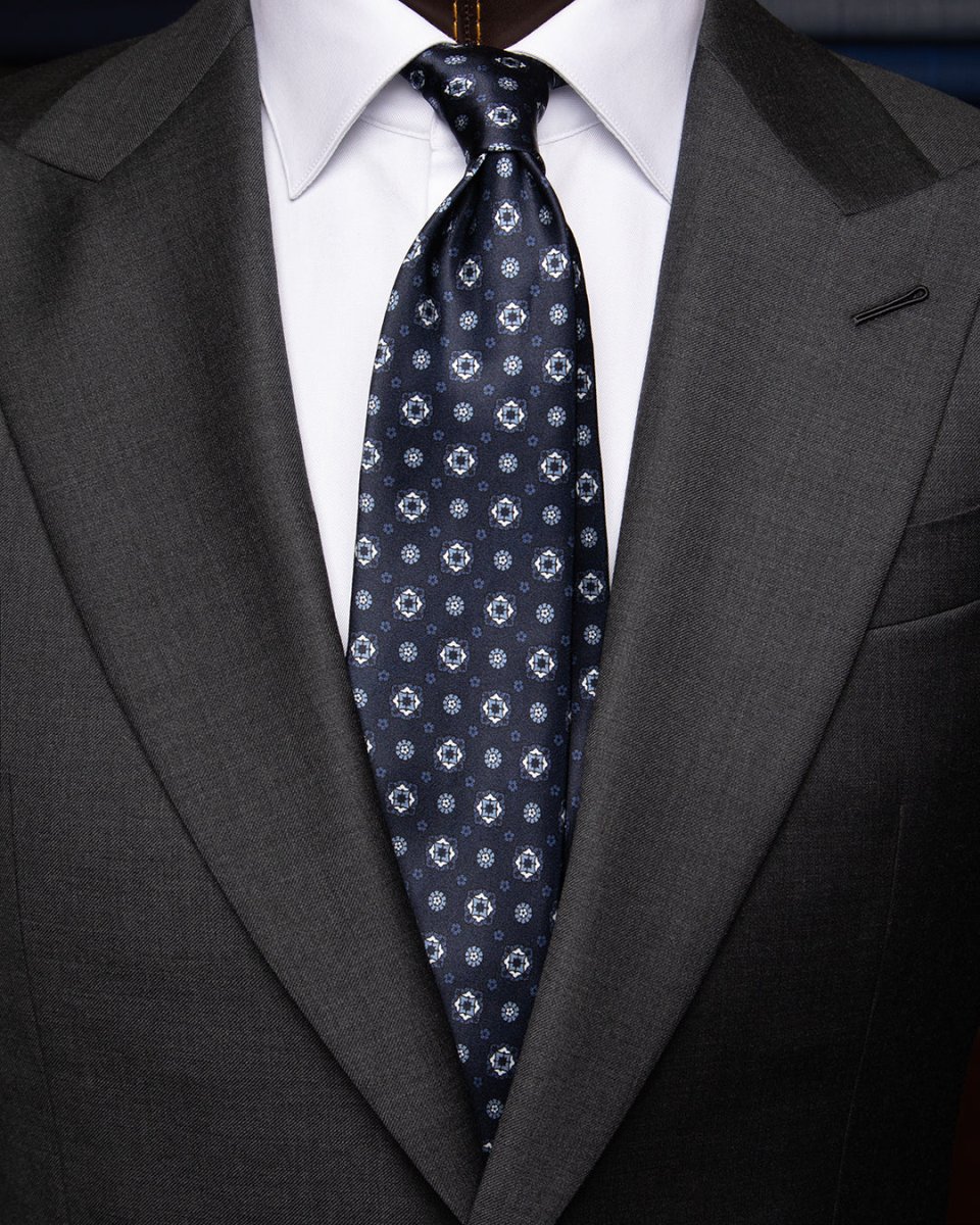 Cravatta Blu Notte con Rombi e Fiori Azzurri