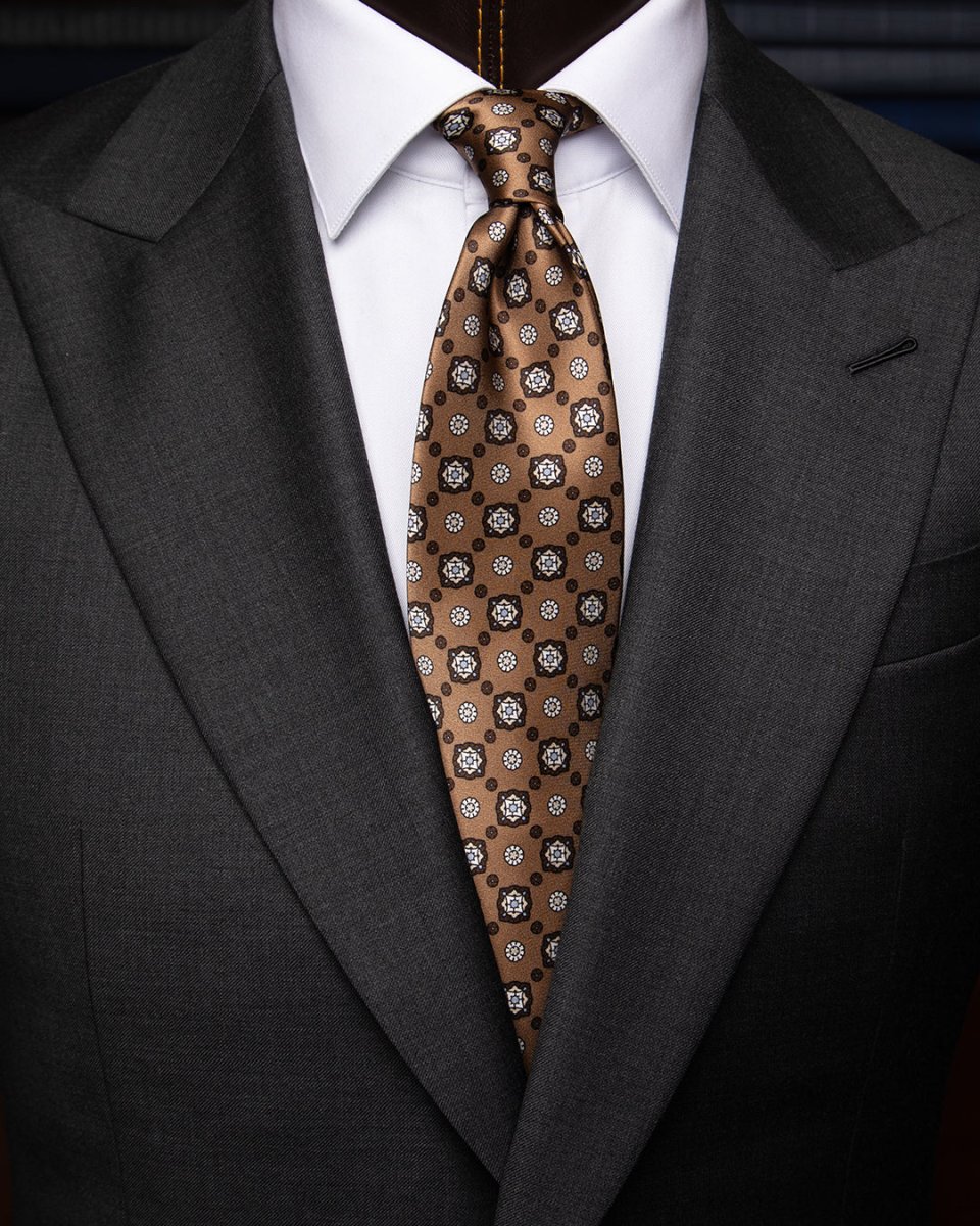 Cravatta Bronzo Fantasia Fiori Bianchi e Marroni
