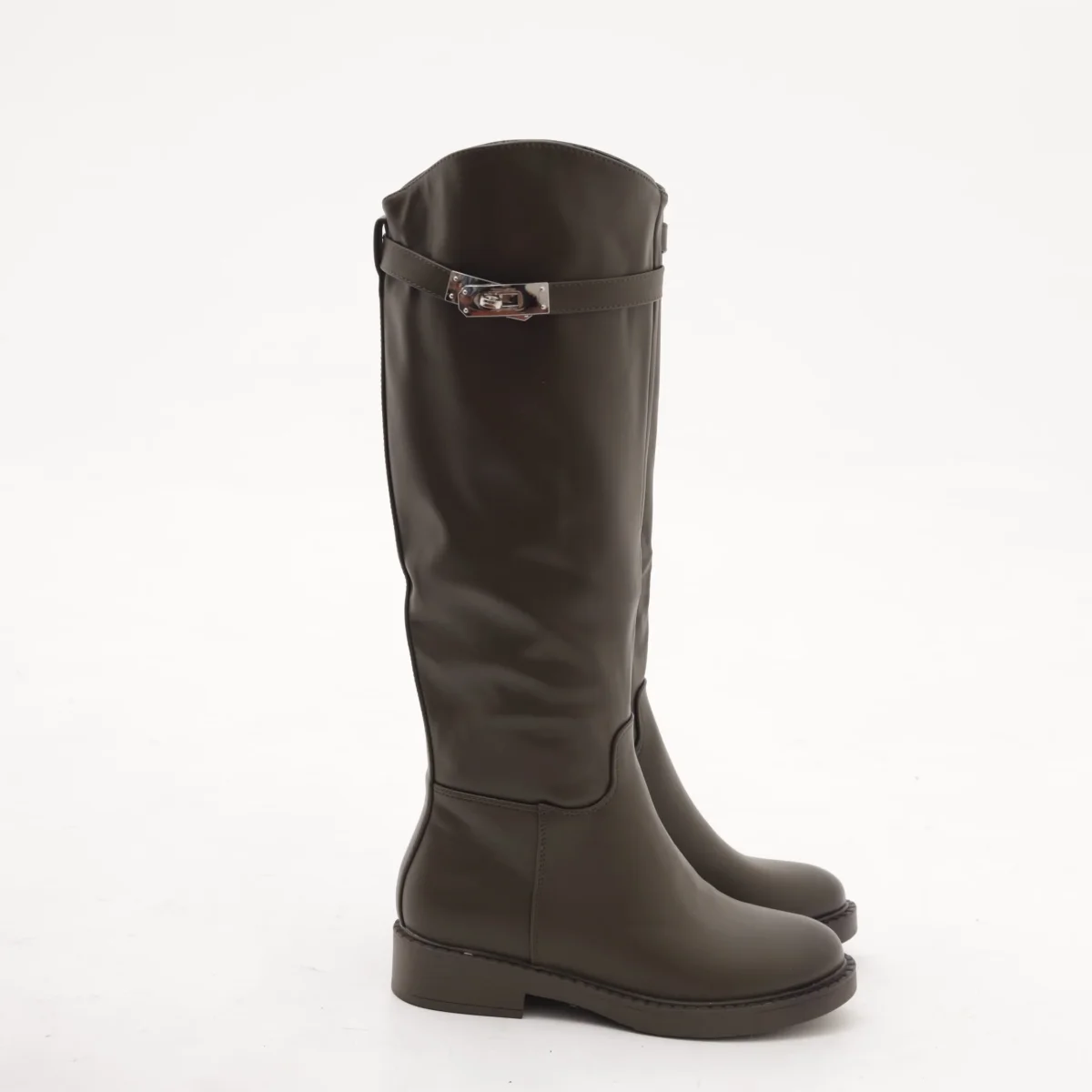 Modello Stivale cavallerizza realizzato in eco-pelle verde. Disponibile anche nel colore Panna e Nero.
