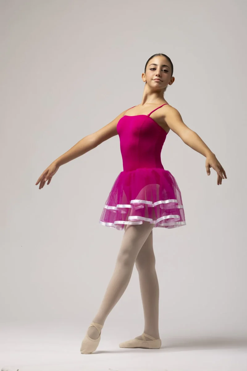 Body giromanica con spalline di gommapiuma, inserti colorati, gonnellina a mezza ruota