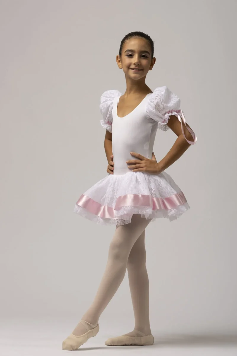 Body di Lycra con maniche a palloncino e gonnellina di tulle e merletto. Rifiniture di raso