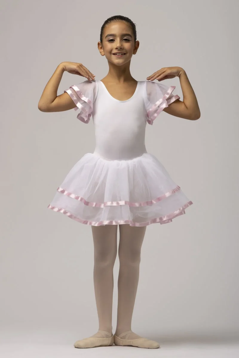 Vestitino con maniche ad aletta e gonnellina di tulle e scintilla, nastri di raso alle maniche e alla gonna