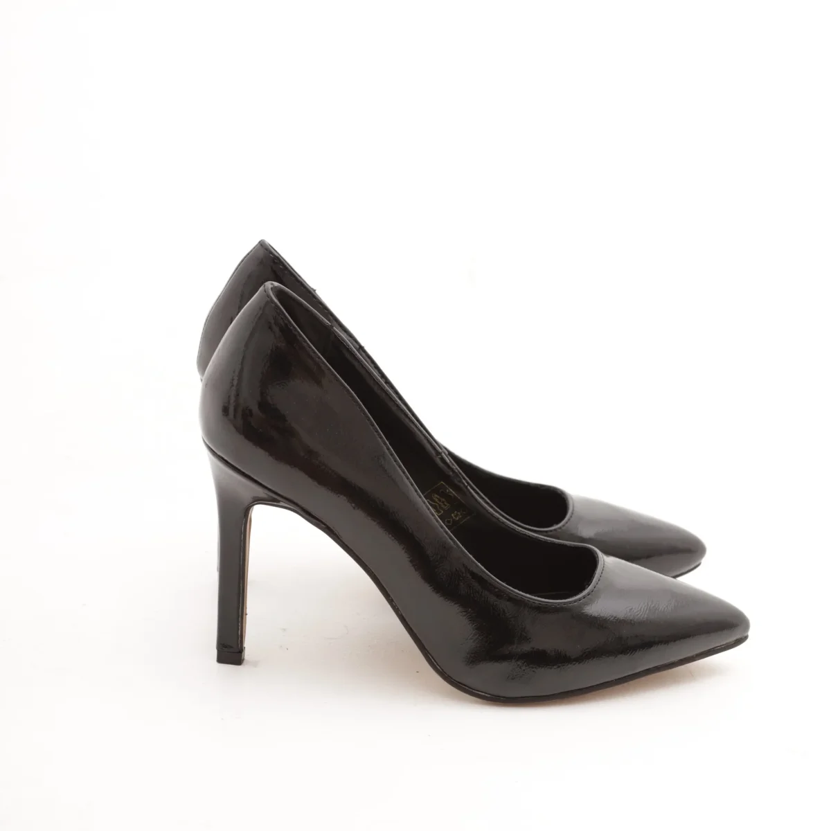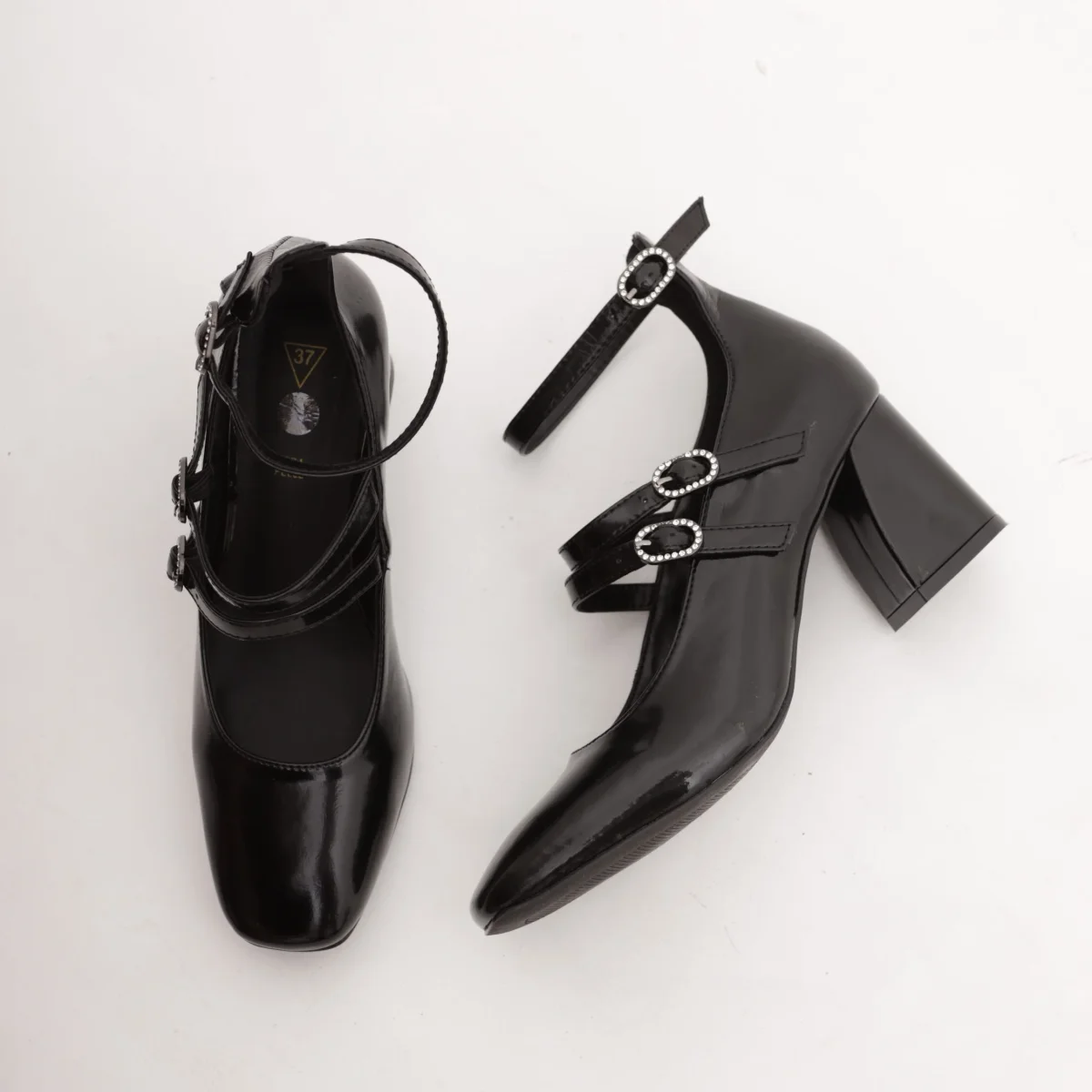 Modello scarpa con tacco realizzato in vernice Nero. Caratterizzato da cinturini sulla parte anteriore. Sottopiede in vera pelle.