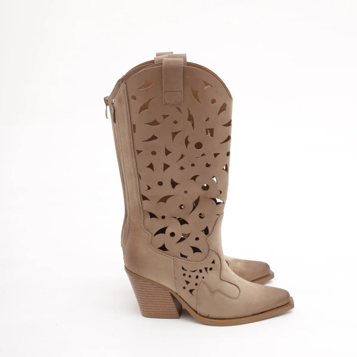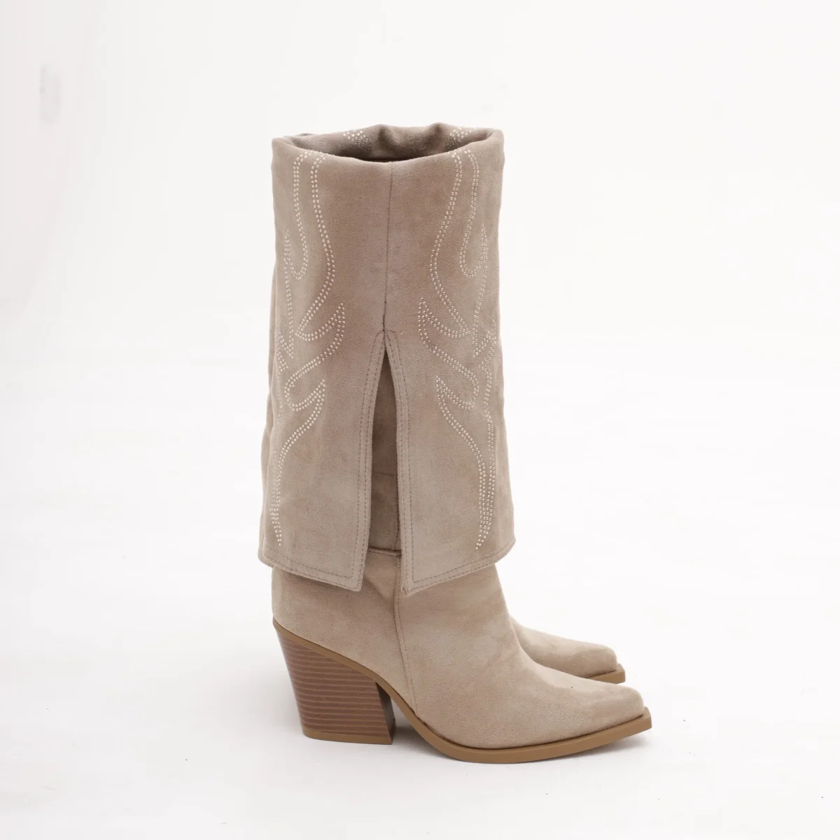 Modello Stivale realizzato in simil-camoscio Tortora. Gambale largo risvoltato. Disponibile anche nel colore Nero.