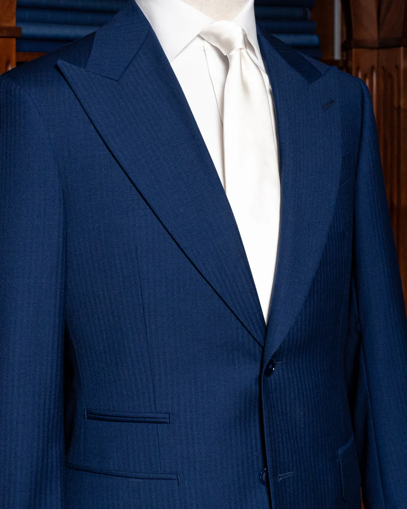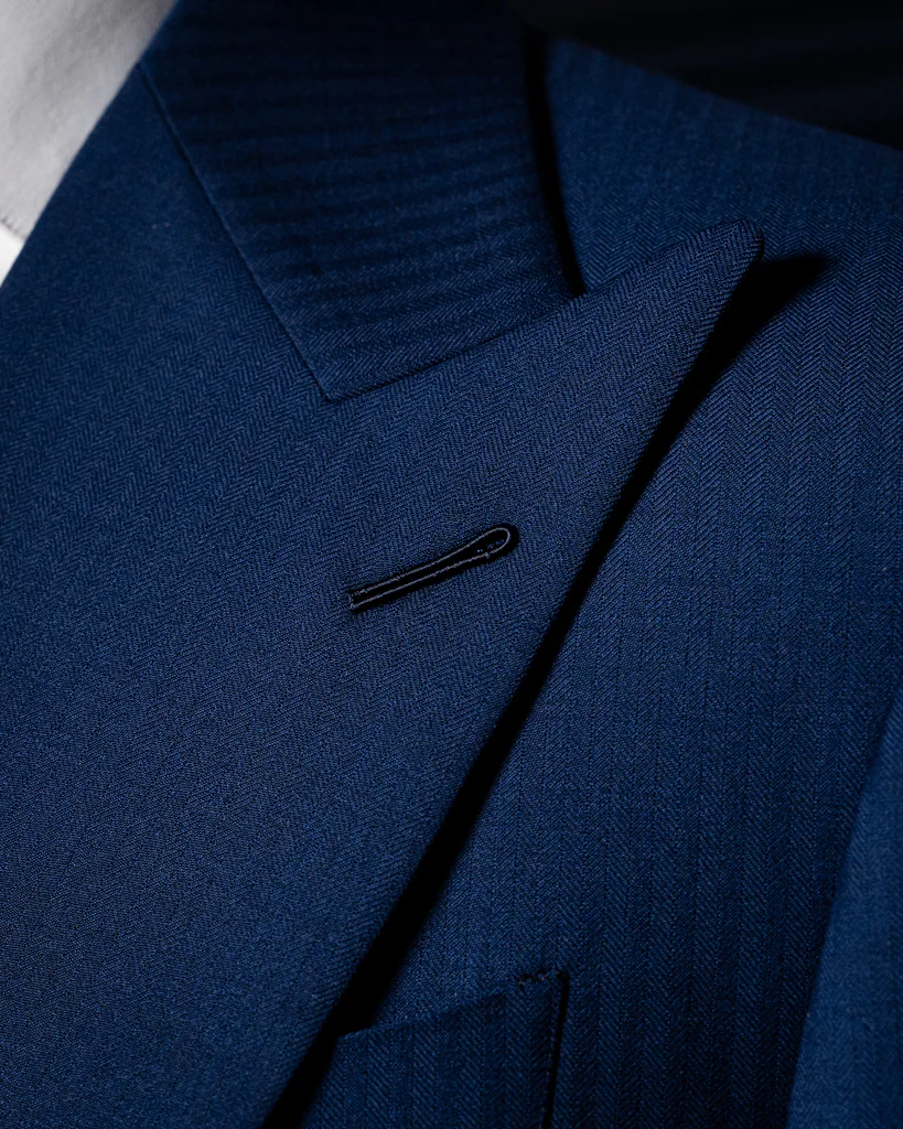 - Tessuto: Pura lana Super 120s Blu Chiaro con armatura spinata.