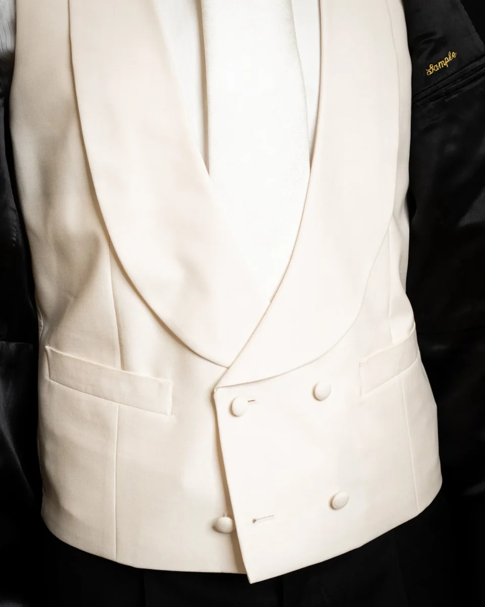 - Gilet d’Élite: Modello doppiopetto 4×2 con moderno scollo a U e tasche a pistagna.