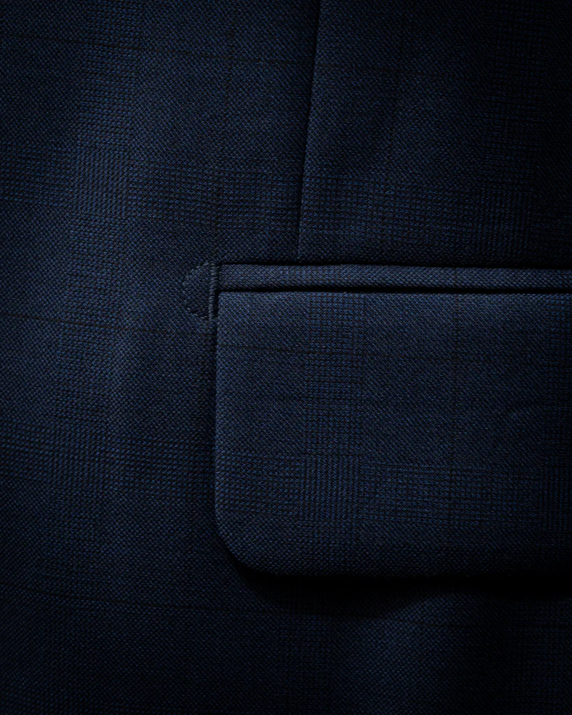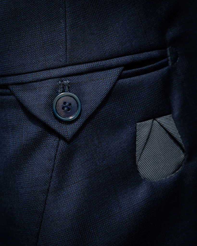 - Tasche: A pattina con l’aggiunta della ticket pocket sempre con pattina, un dettaglio classico del tailoring britannico.