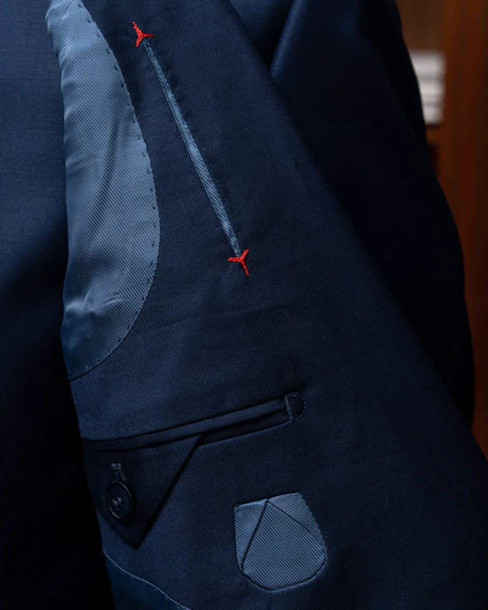- La Giacca: Costruzione a due bottoni con ampi rever a lancia. Le tasche a pattina conferiscono una struttura solida e tradizionale. All’interno, la fodera in viscosa color Avio garantisce traspirabilità e un contrasto di tonalità azzurrata raffinatissimo.