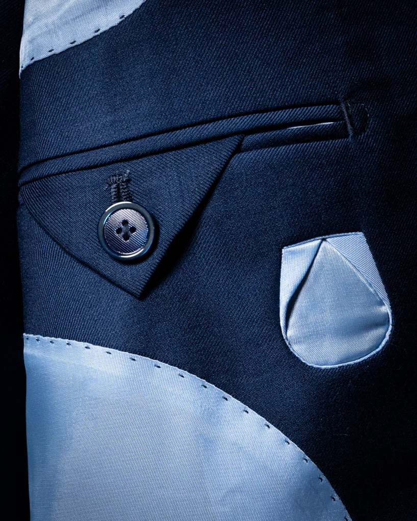 L’Abito Bernini in questa sfumatura Blu Pavone è una dichiarazione di stile per chi cerca una distinzione autorevole. La giacca a due bottoni è dominata dal rever a lancia, che conferisce una postura decisa e slancia la figura verso l’alto. La scelta delle tasche a filetto e dei bottoni in madreperla mantiene il fronte della giacca pulito e prezioso, mentre l’interno rivela una fodera color avion, che aggiunge un contrasto cromatico fresco e raffinato.