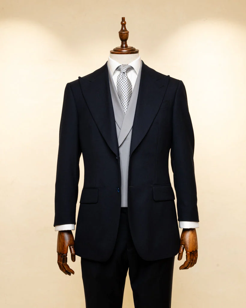L’elemento di rottura e distinzione è il gilet doppiopetto grigio a 6 bottoni. Caratterizzato da un elegante rever sciallato, il gilet spezza la monocromia del blu apportando una nota di luce e classicità britannica all’ensemble. Il pantalone completa l’opera con un taglio moderno: la linea è pulita e senza pinces, mentre la presenza dei passanti permette una personalizzazione pratica con una cintura coordinata.