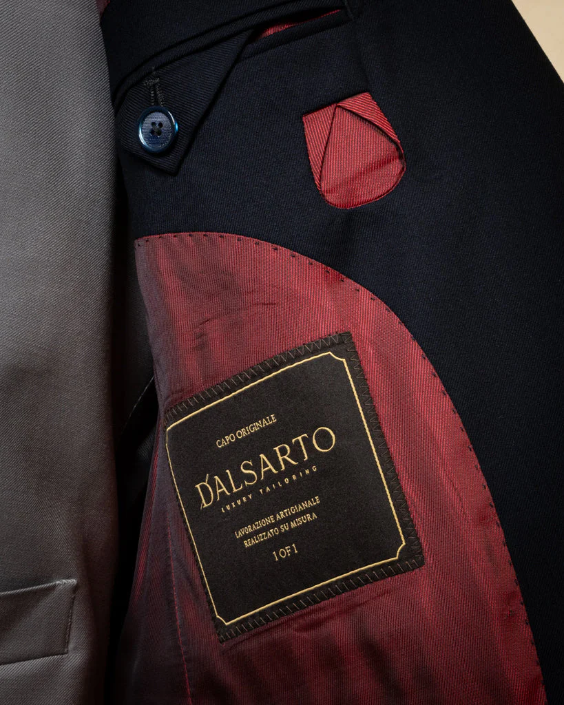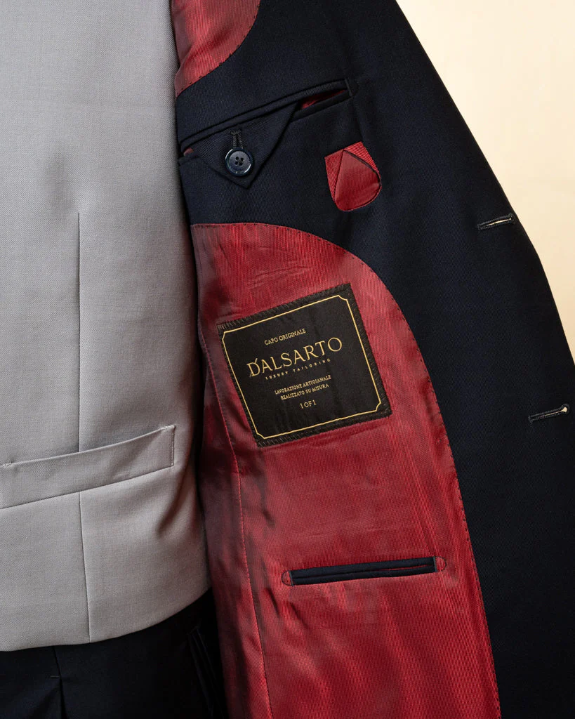 - Dettagli Sovrani: Bottoni in autentica madreperla blu coordinati alla giacca.