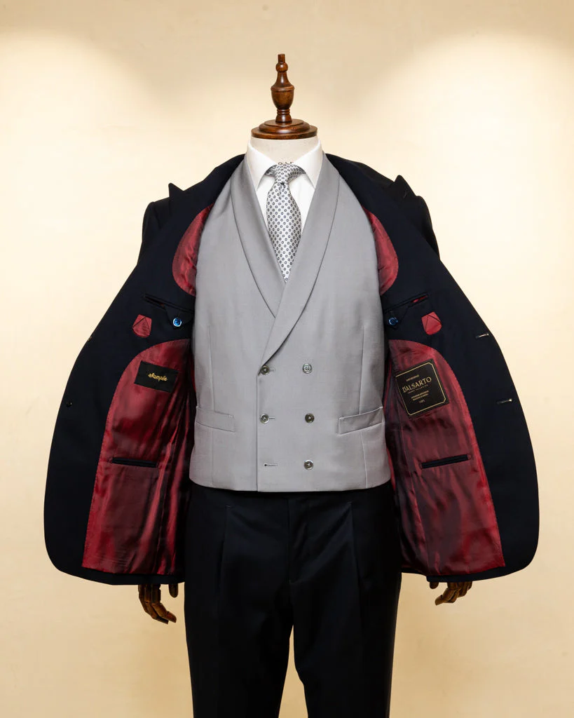 - Il Gilet: Modello doppiopetto a 6 bottoni in colore grigio, con raffinato rever sciallato.