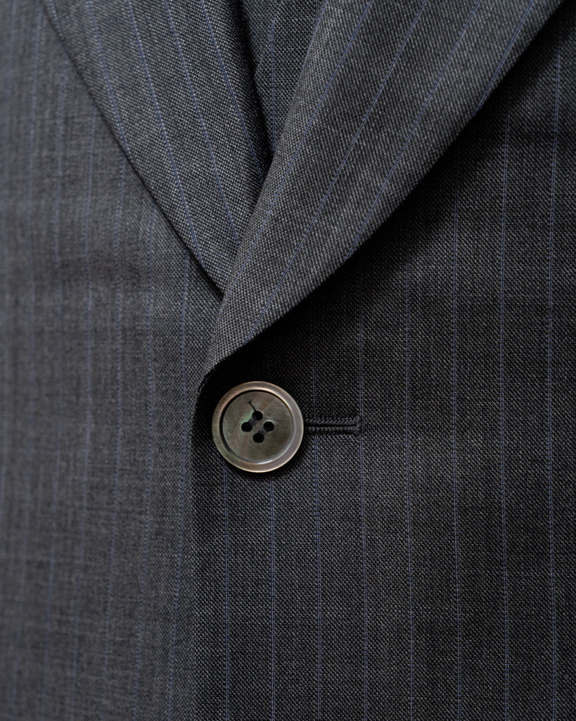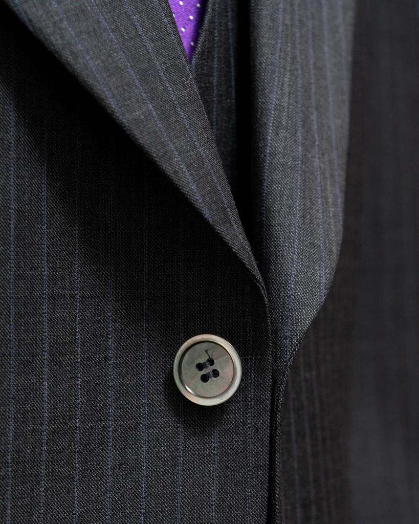 - Bottoni in madreperla grigia e fodera interna rossa in cashmere: dettagli di alta qualità.
