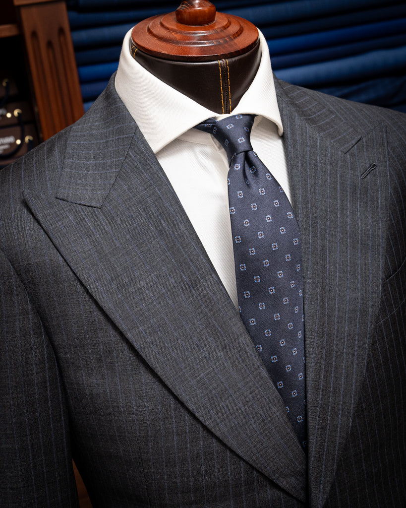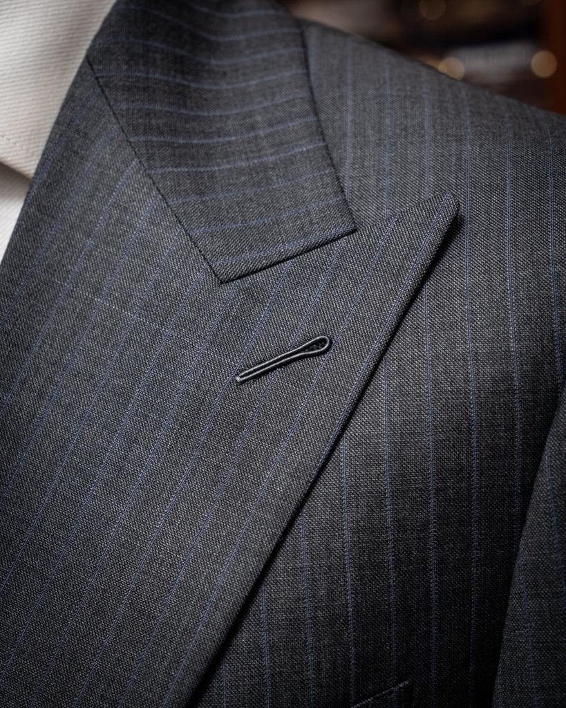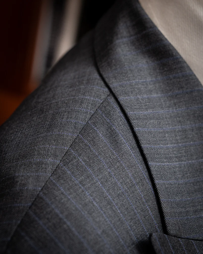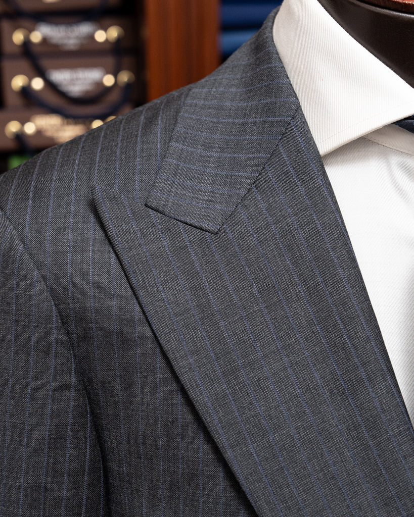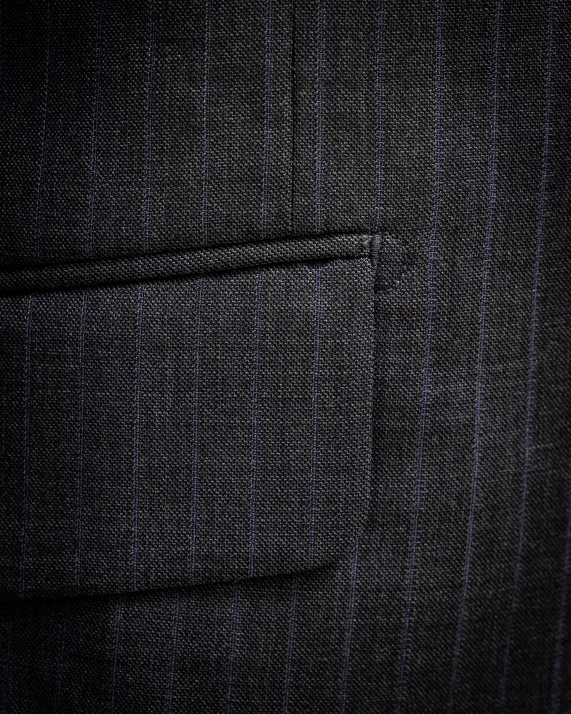 Materiale di Qualità: Realizzato con un tessuto grigio scuro gessato di alta qualità,con una riga blu, questo abito offre comfort e durata eccezionali.