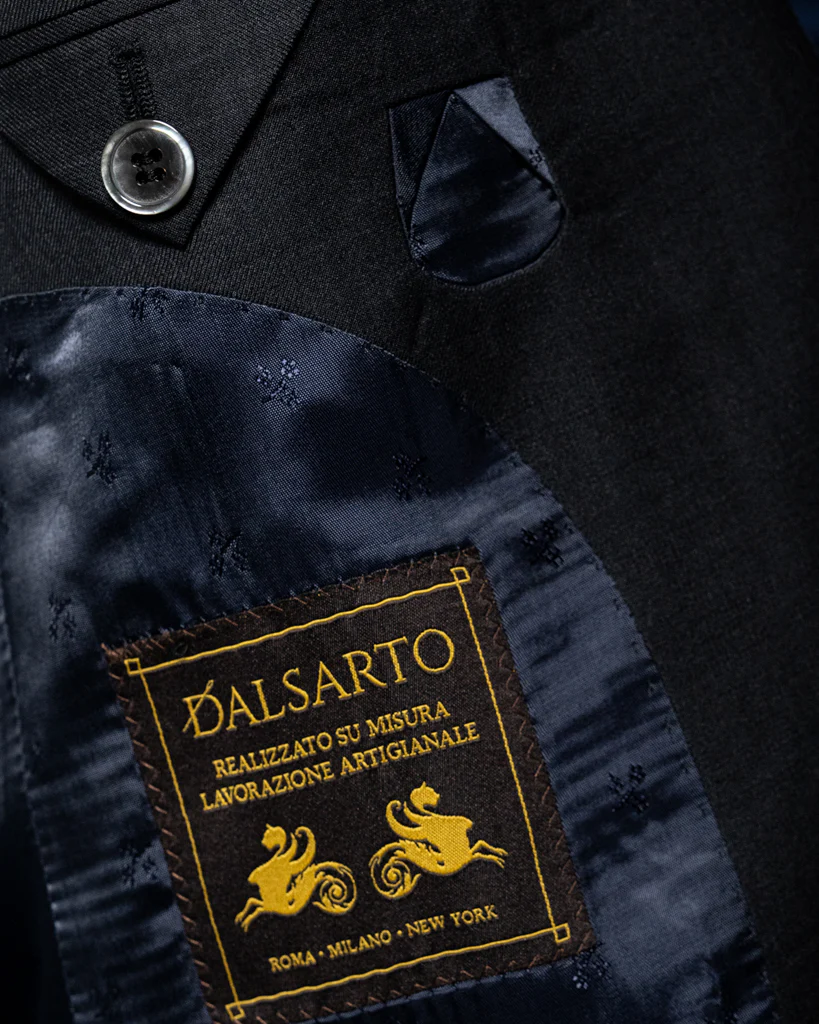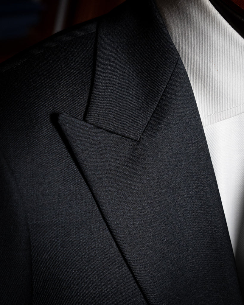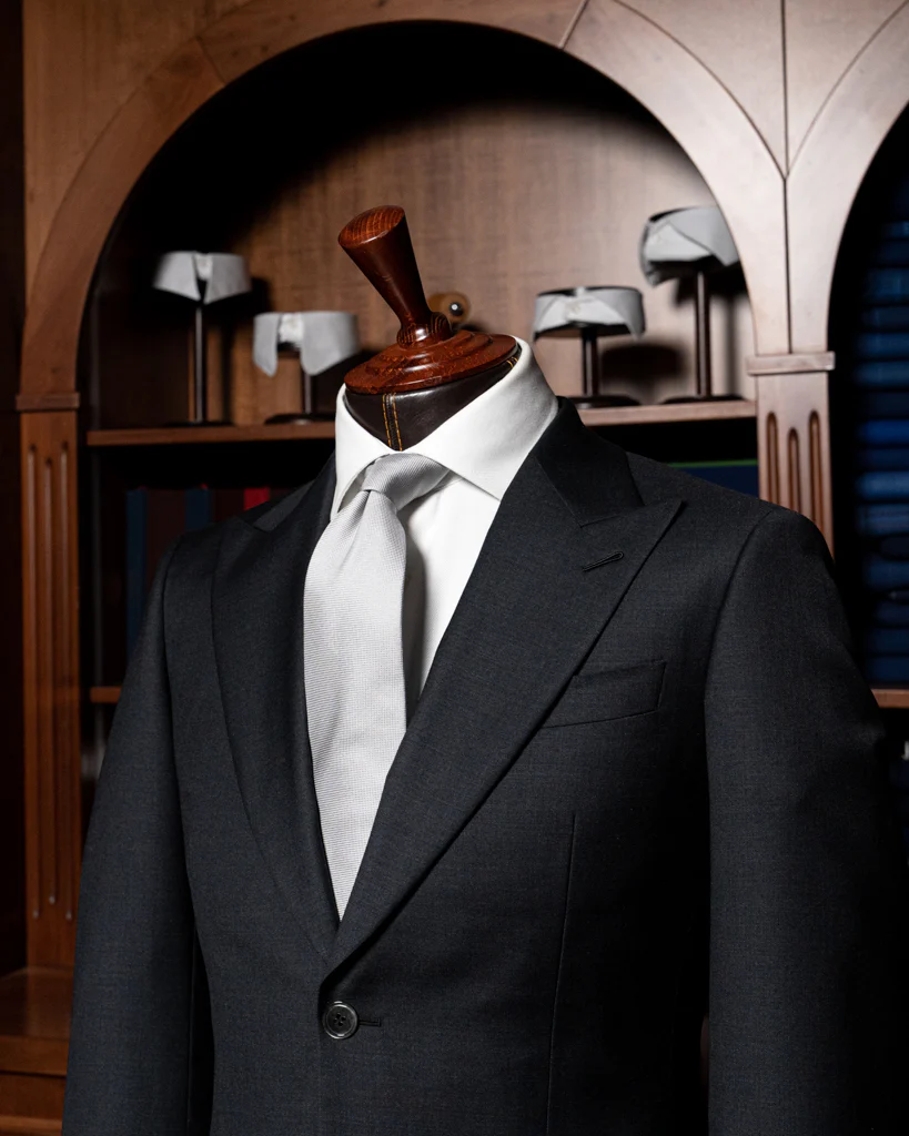 L’Abito Bernini si distingue per un’estetica che comunica energia e autorità. Il tessuto in lana pregiata Grigio Antracite offre una profondità magnetica, esaltata dalla luce che scivola sulla sua trama finissima. Il punto focale della giacca è il rever a lancia, che proietta le linee del busto verso l’alto, allargando visivamente le spalle e conferendo una postura atletica e decisa.