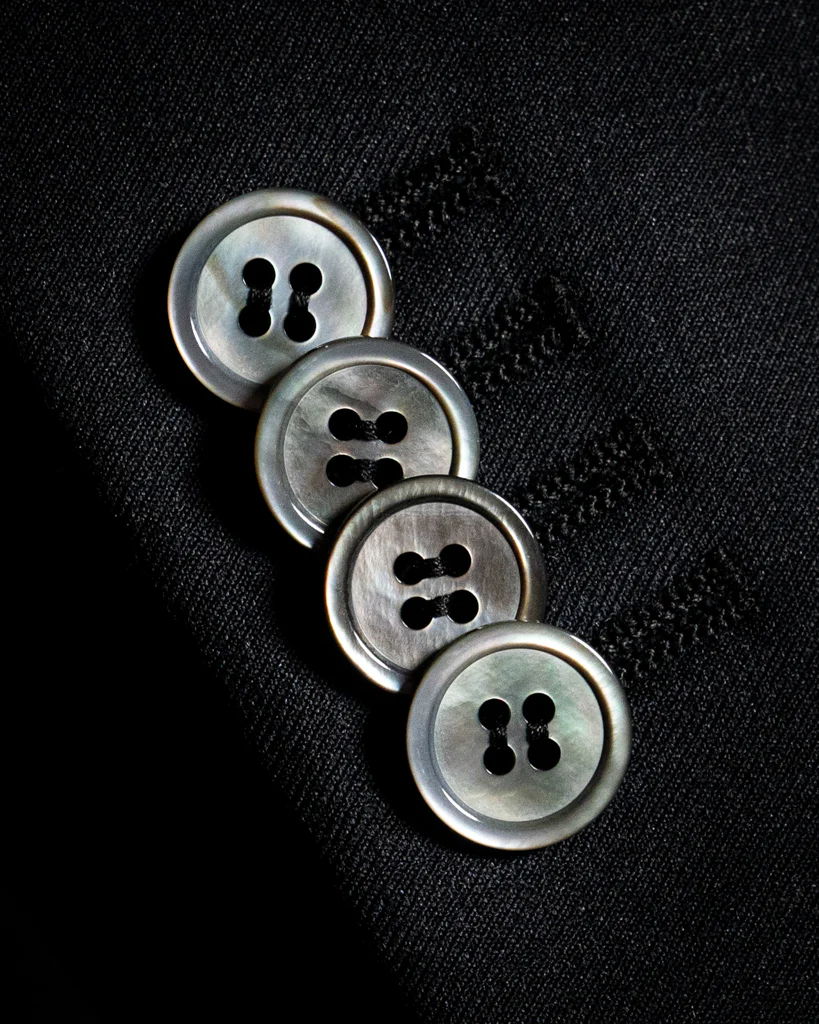 - Dettagli Sovrani: Bottoni in autentica madreperla grigia e tasche a filetto.