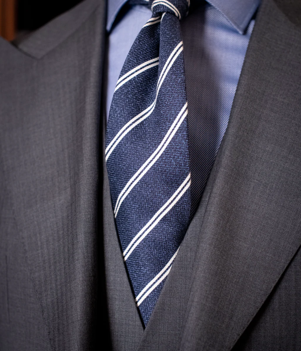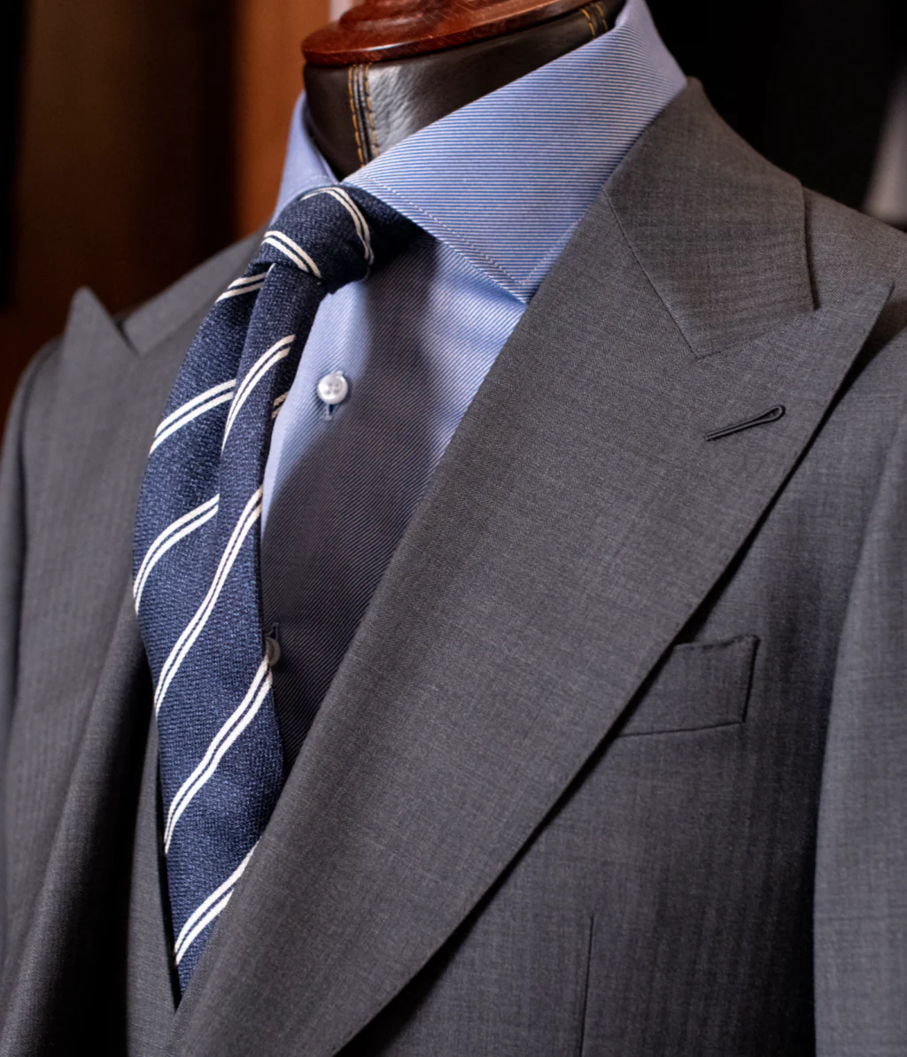 - Il Gilet: Modello monopetto a 4 bottoni doppiopetto, perfettamente sagomato per chiudere il triangolo del busto e valorizzare la cravatta.