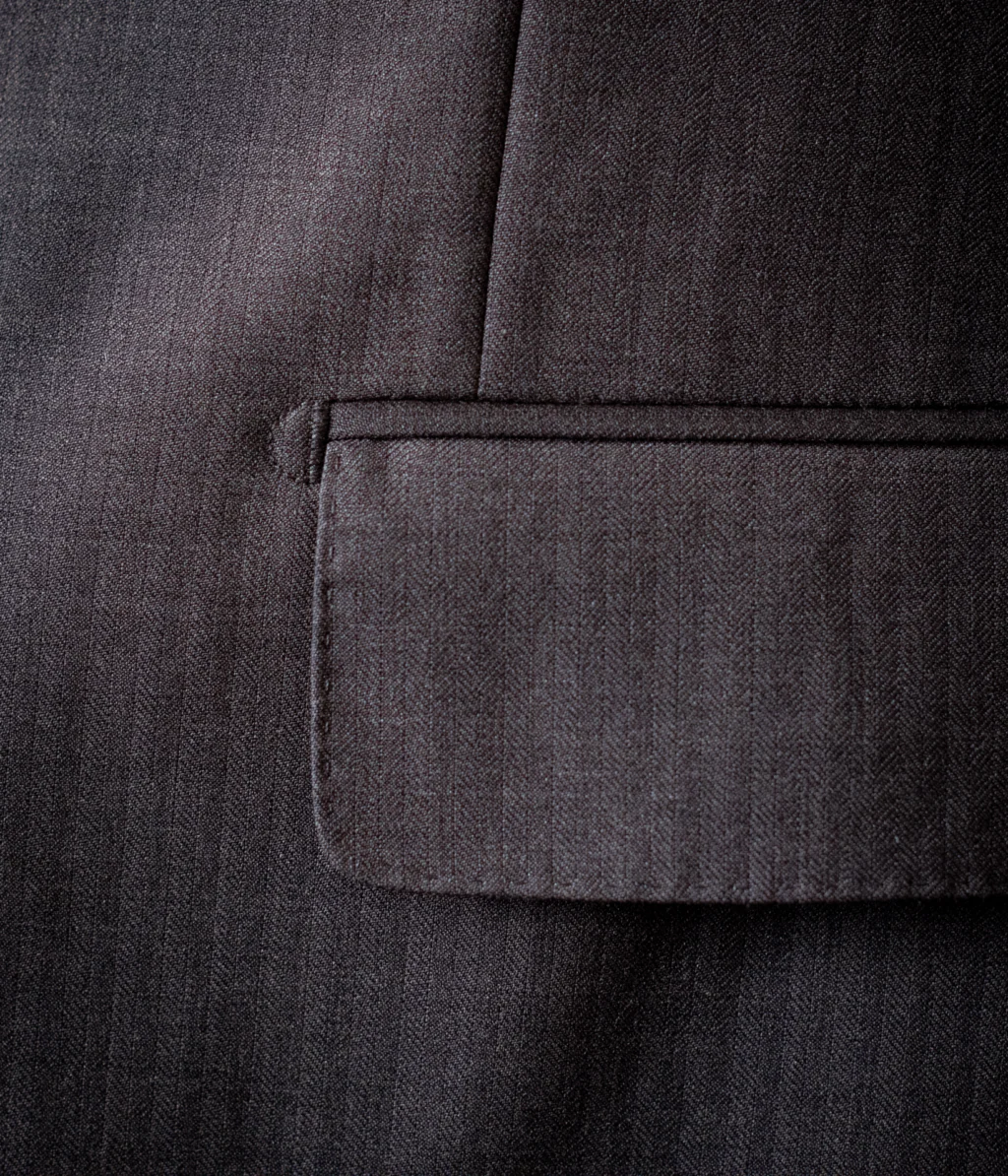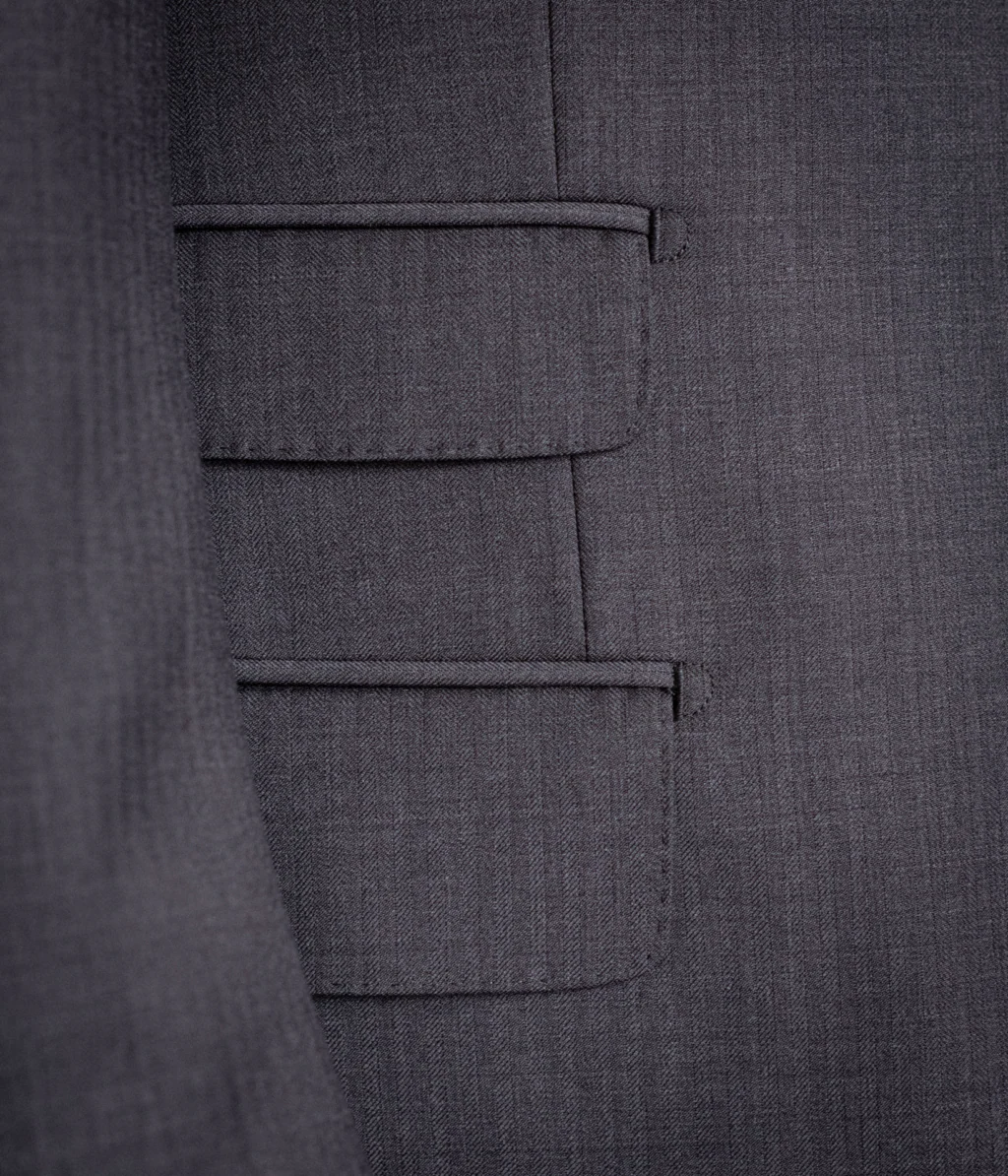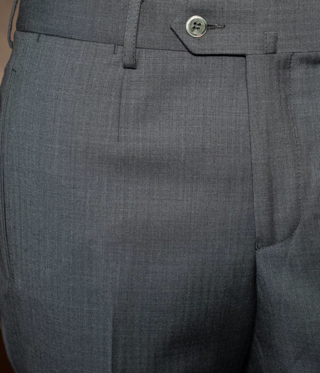 - Tessuto: Lana pettinata di alta qualità con armatura Herringbone. La micro-trama spinata assicura un’ottima resistenza alle pieghe e un appiombo superiore.