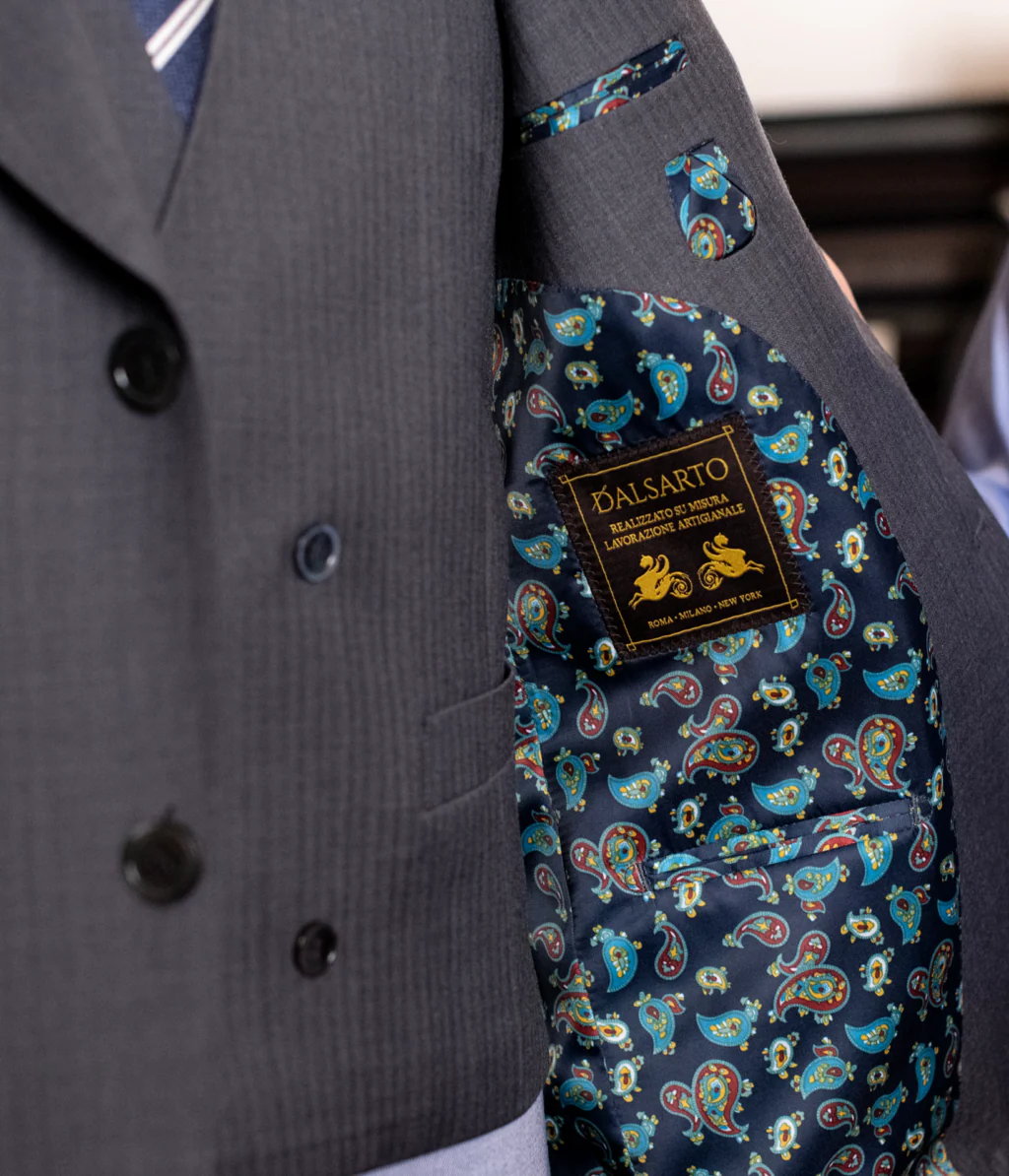 - La Giacca: Modello a due bottoni con ampio rever a lancia. Il dettaglio distintivo è è la tasca ticket pocket sul lato destro, un richiamo alla tradizione sartoriale britannica che aggiunge un tocco di ricercatezza vintage.