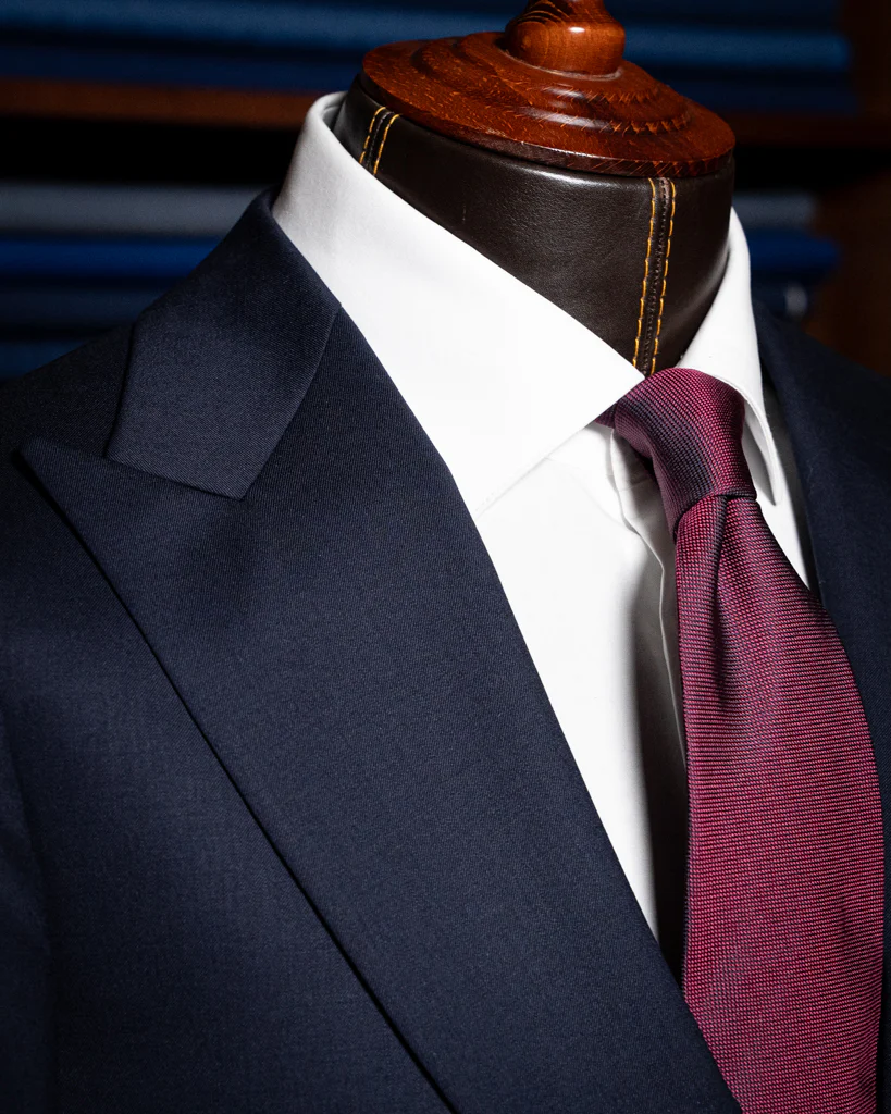 L’Abito Bernini in versione Midnight Blue è il simbolo dell’eleganza notturna trasportata nel guardaroba executive e cerimoniale. La giacca a due bottoni si distingue per il maestoso rever a lancia, un dettaglio che conferisce una proiezione atletica al busto e una presenza scenica superiore rispetto al rever classico. La scelta delle tasche a filetto sottolinea la volontà di mantenere una silhouette piatta e pulita, esaltando la continuità del tessuto.