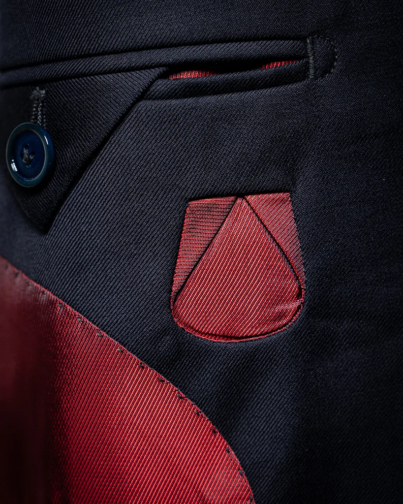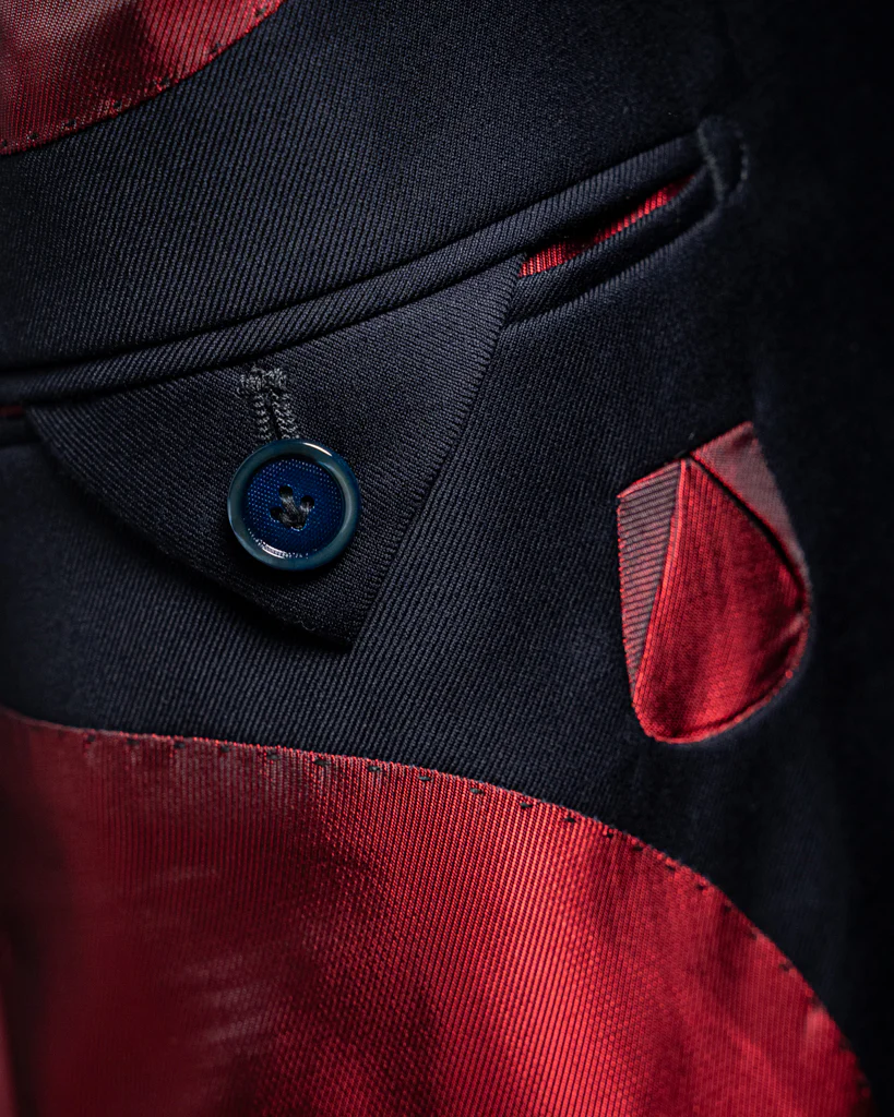 Il vero segreto architettonico è custodito all’interno: una fodera bordeaux cangiante che crea un contrasto magnetico e sofisticato con la profondità del blu esterno. I due spacchi posteriori assicurano una fluidità di movimento assoluta, mantenendo inalterata la precisione del taglio durante ogni gesto.