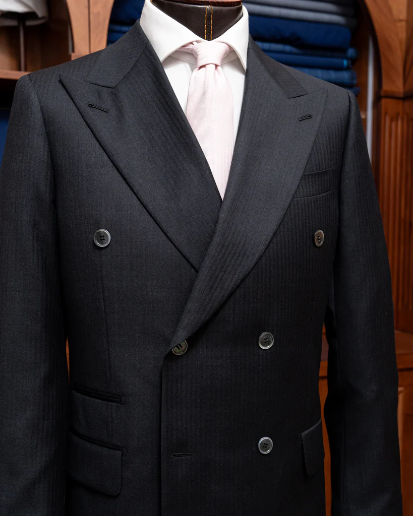 - Tessuto Dark Grey Spinato: Il tessuto Dark Grey Spinato, scelto con cura per la sua qualità superiore e la sua resistenza, aggiunge una nota di ricercatezza al completo. La sua trama sottile e raffinata dona profondità al colore grigio scuro, conferendo al completo una presenza magnetica e una versatilità senza pari.