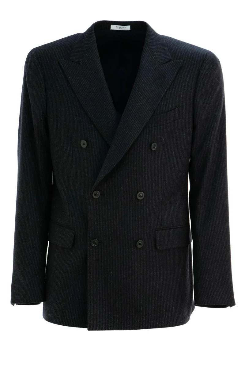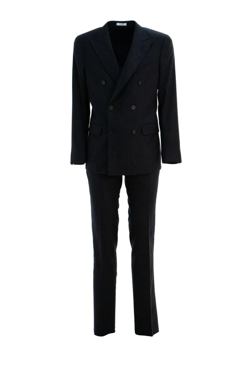 Abito Doppiopetto Composizione: 68% lana vergine, 30% poliestere, 2% elastan, fodera in 63% viscosa, 37% poliestere. Prodotto in Italia