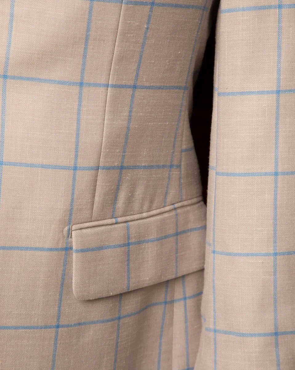 • Tessuto di Alta Qualità: Realizzato con un tessuto beige finestrato, questo abito offre non solo un aspetto raffinato, ma anche una sensazione di lusso e comfort che solo i materiali pregiati possono garantire.