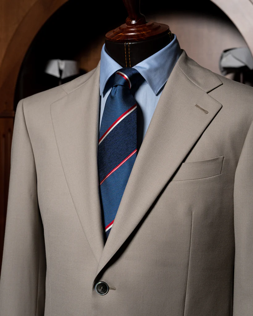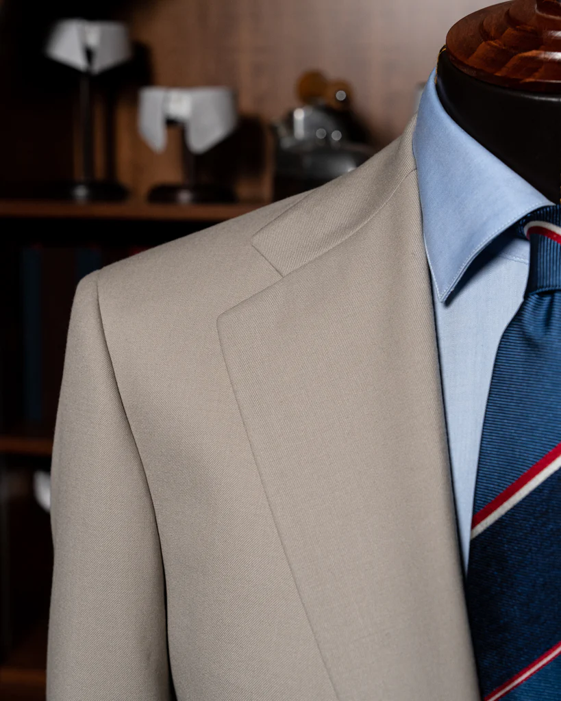 - Realizzato con tessuto beige in lana di alta qualità, questo abito offre un aspetto elegante e professionale che ti farà distinguere.
