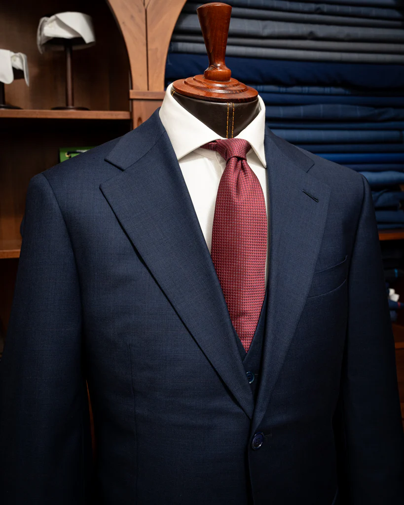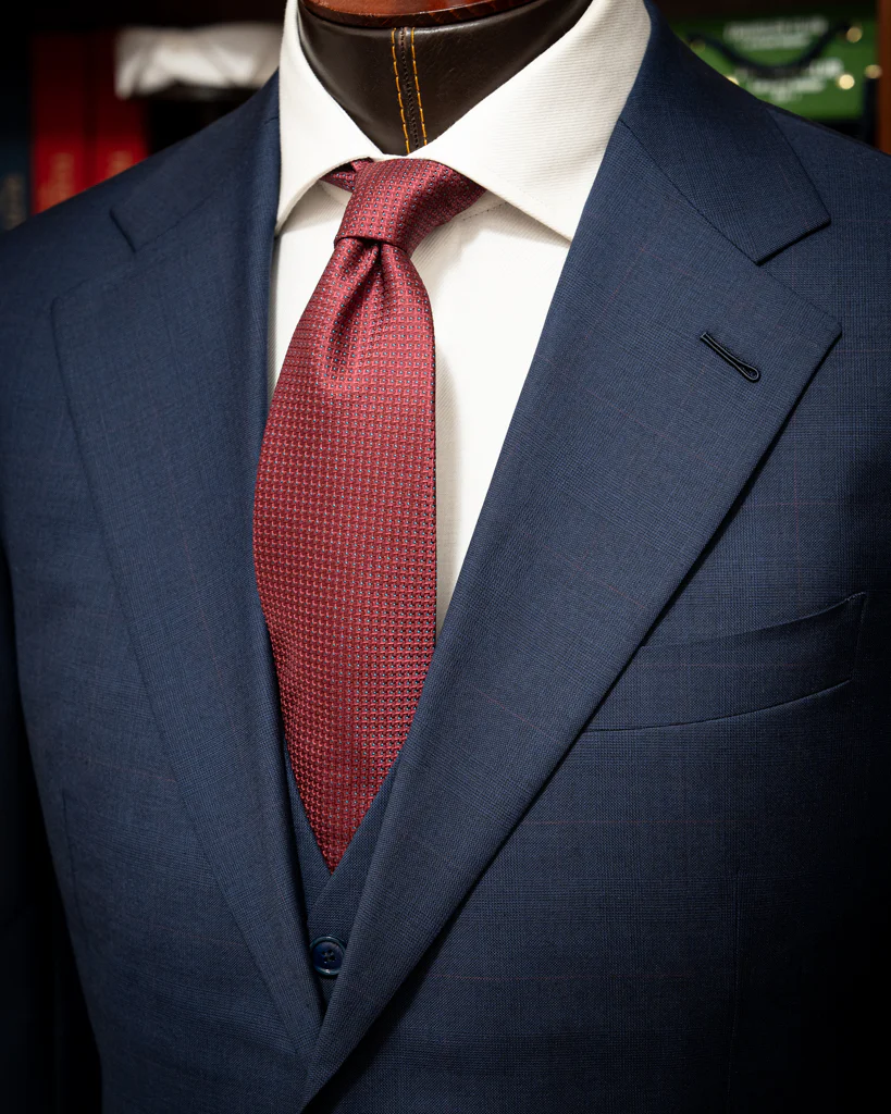 Abito Giotto Blu con Micro Quadri Rossi e Gilet: Eleganza Business Distinta