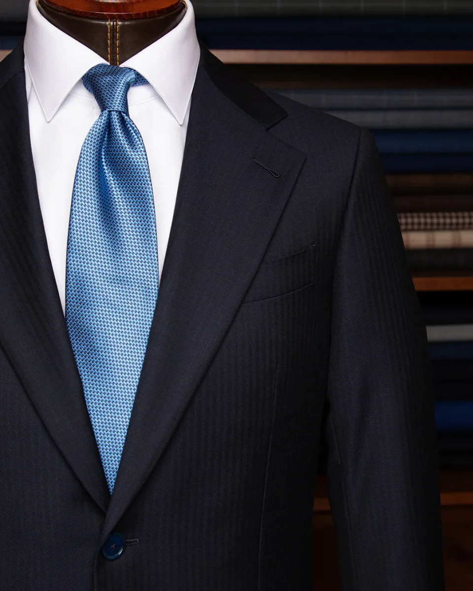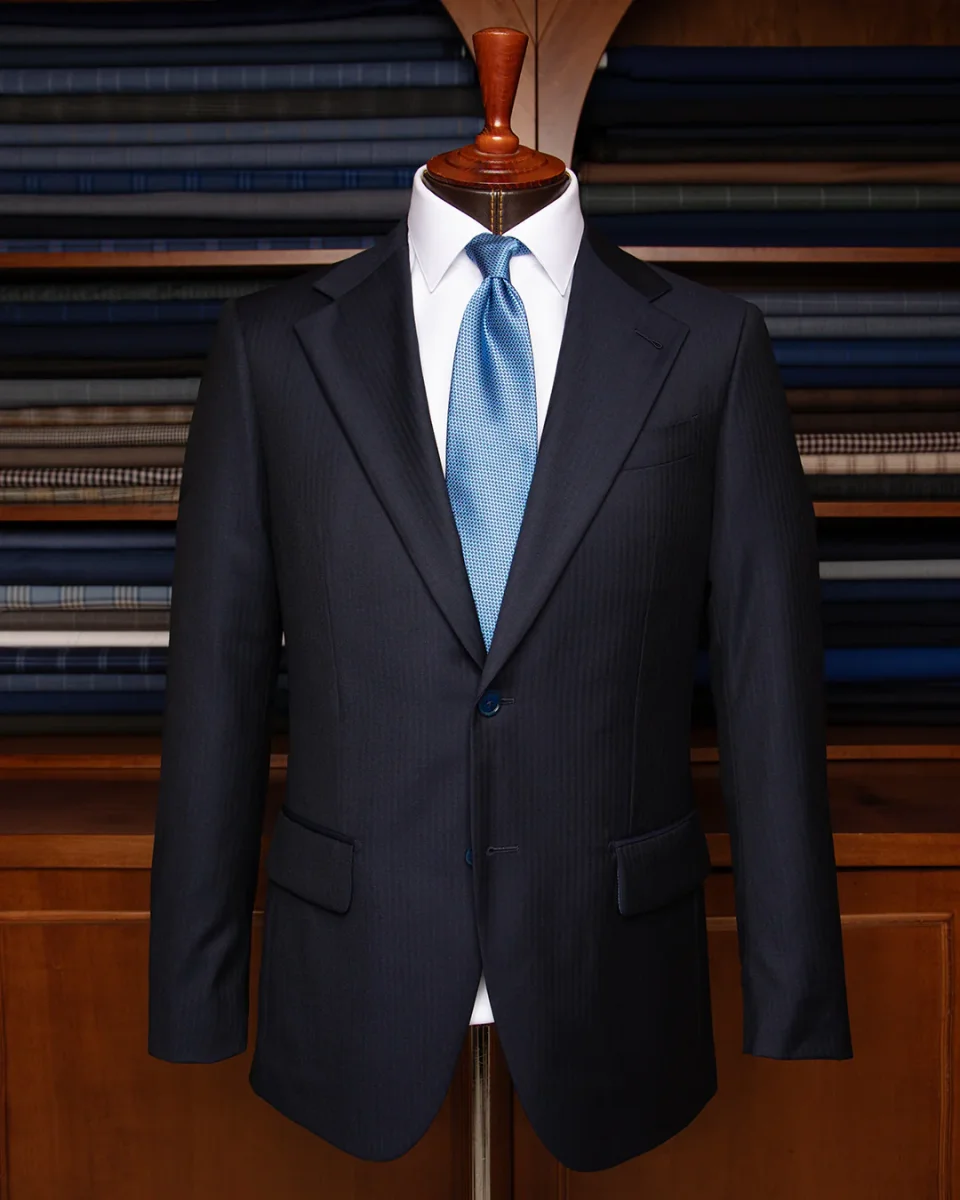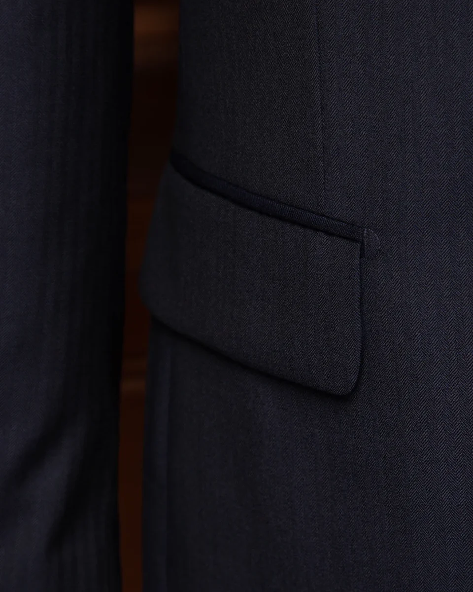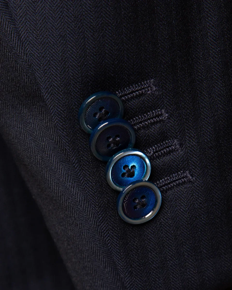 - Materiale: Pura lana Super 120s in trama spigata blu scuro ad alta definizione.