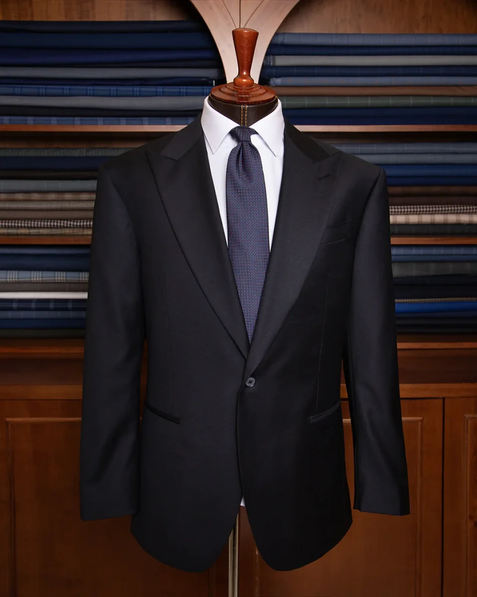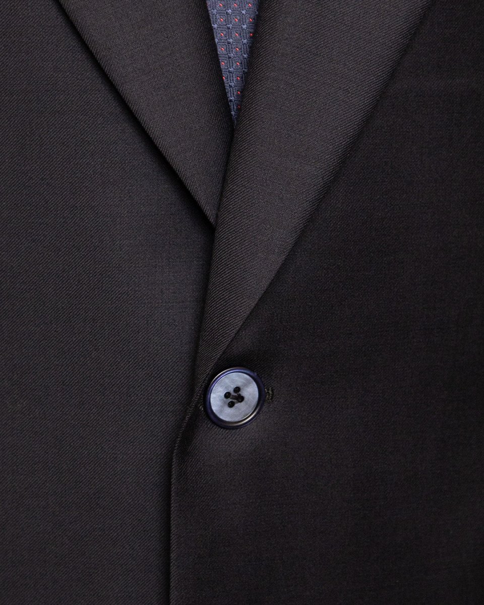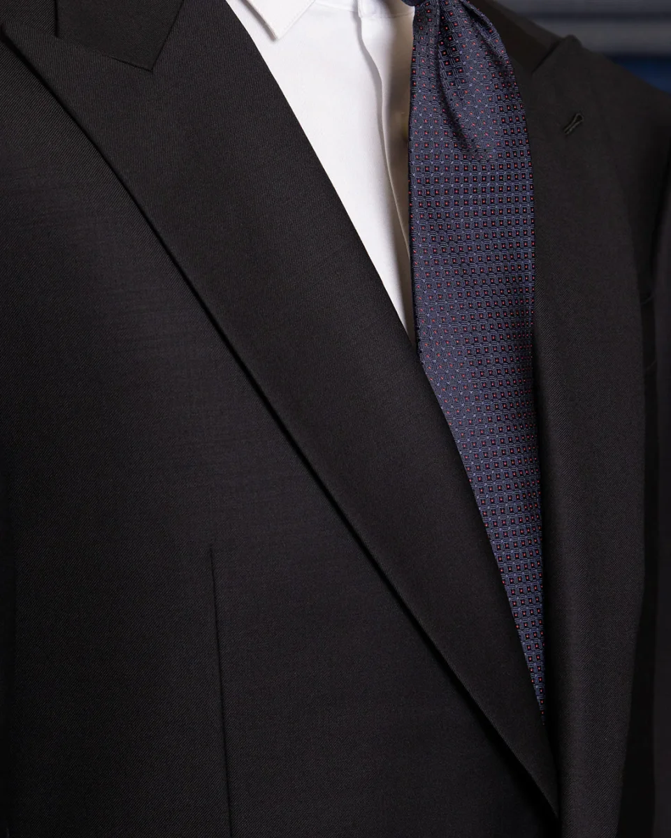 Il contrasto tra l’oscurità del tessuto esterno e il calore vibrante del rosso interno trasforma questo abito in una dichiarazione di stile per l’uomo che non teme di mostrare il proprio carattere attraverso i dettagli sartoriali.