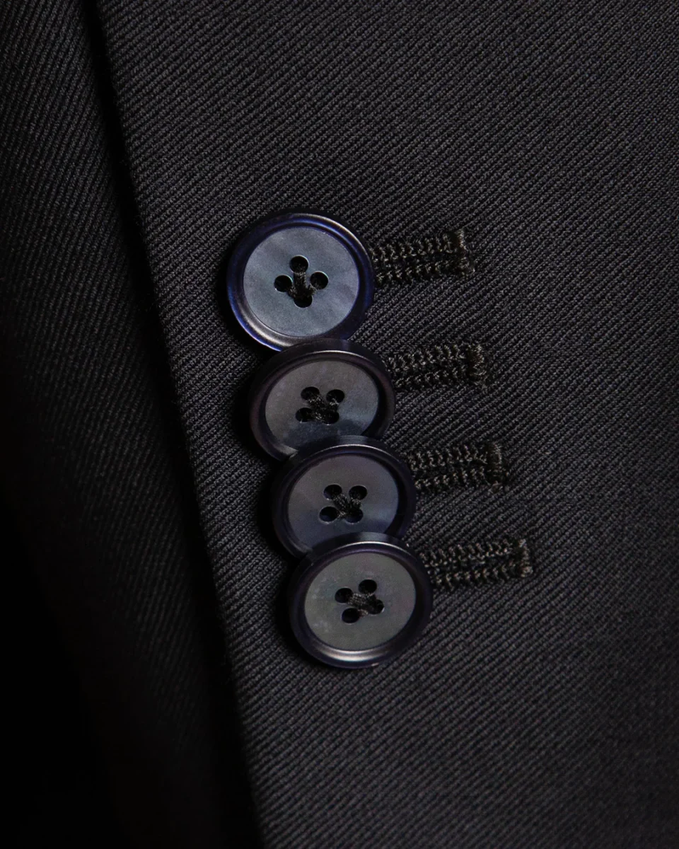 - Finiture: Bottoni in madreperla blu, che aggiungono riflessi organici e profondi, armonizzandosi con la base scura.