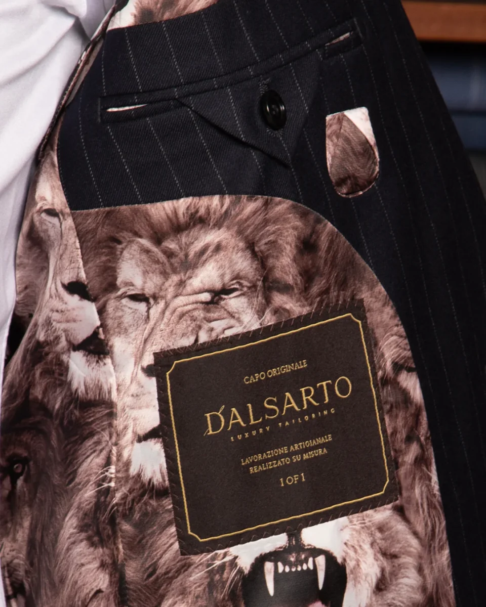 Realizzato in tessuto blu scuro gessato di alta qualità, garantisce comfort, struttura e una vestibilità impeccabile. La giacca a un bottone con rever a lancia e tasche a filetto definisce una linea slanciata e raffinata. La fodera interna con stampa leone aggiunge un dettaglio esclusivo e distintivo, simbolo di carattere e stile deciso. Il pantalone senza pinces, dotato di tirantino laterale, completa l’abito con una vestibilità sartoriale pulita e funzionale.