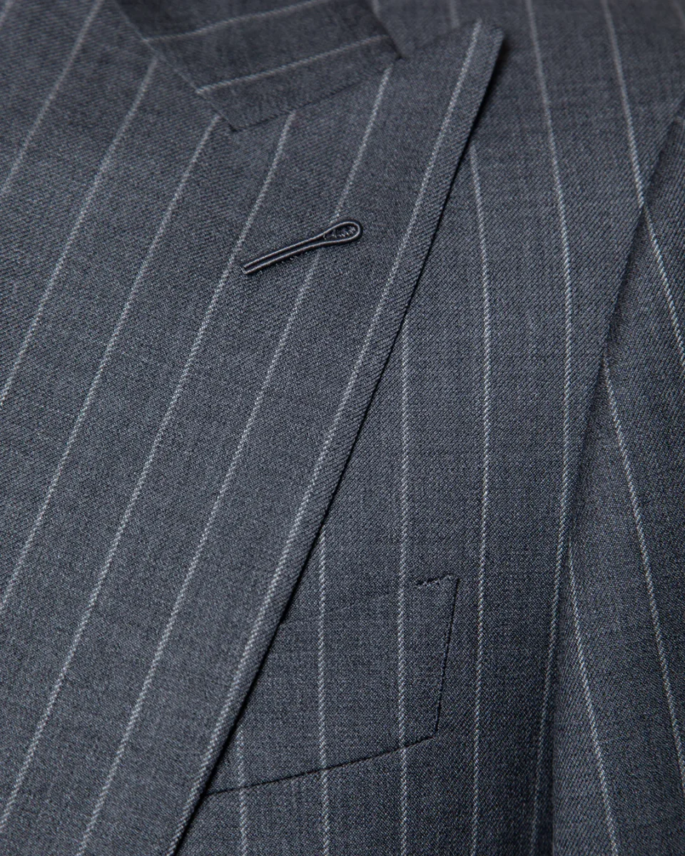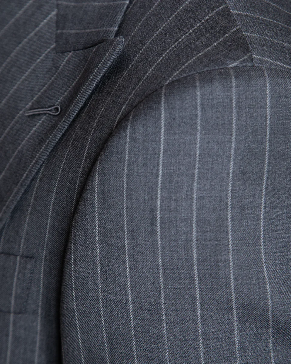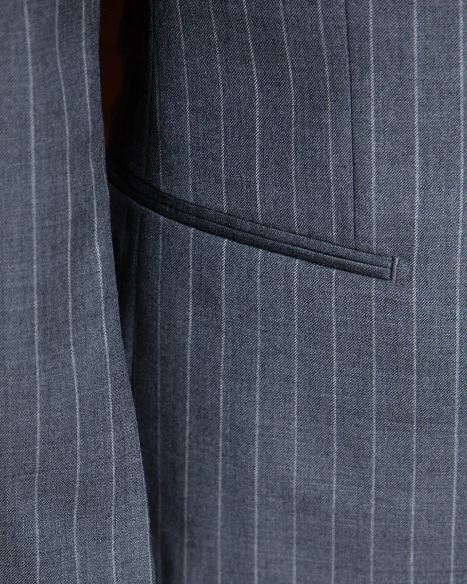 L’elemento distintivo del design è il rever a lancia, che conferisce alla giacca una postura decisa e dinamica. La scelta tecnica dell’abbottonatura singola esalta la pulizia del fronte, mentre le tasche a filetto si integrano perfettamente nella struttura, preservando la continuità visiva del pattern gessato e sottolineando il minimalismo sofisticato del modello.