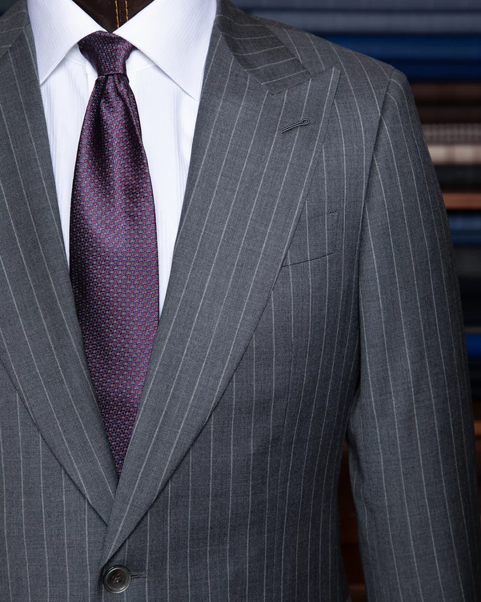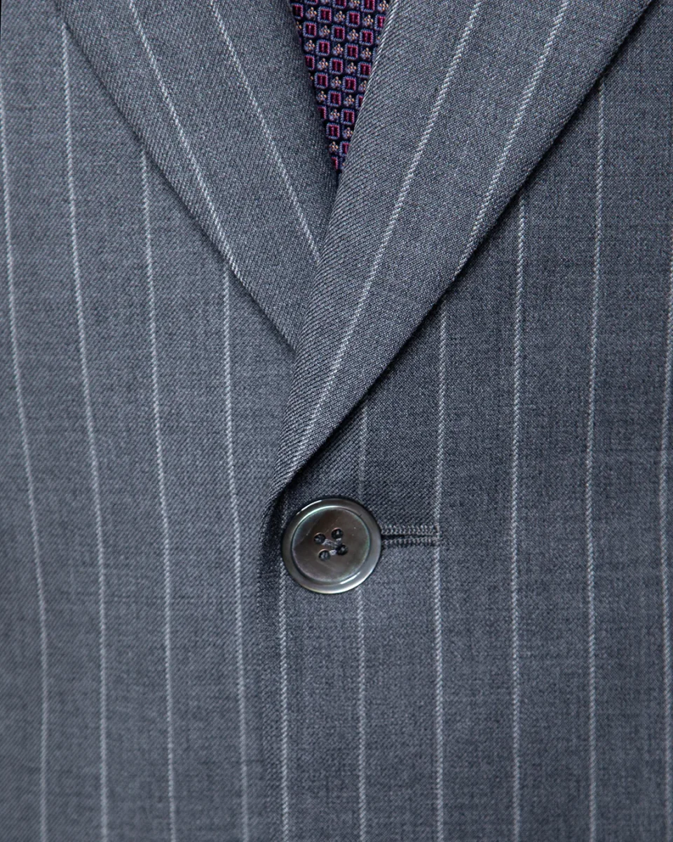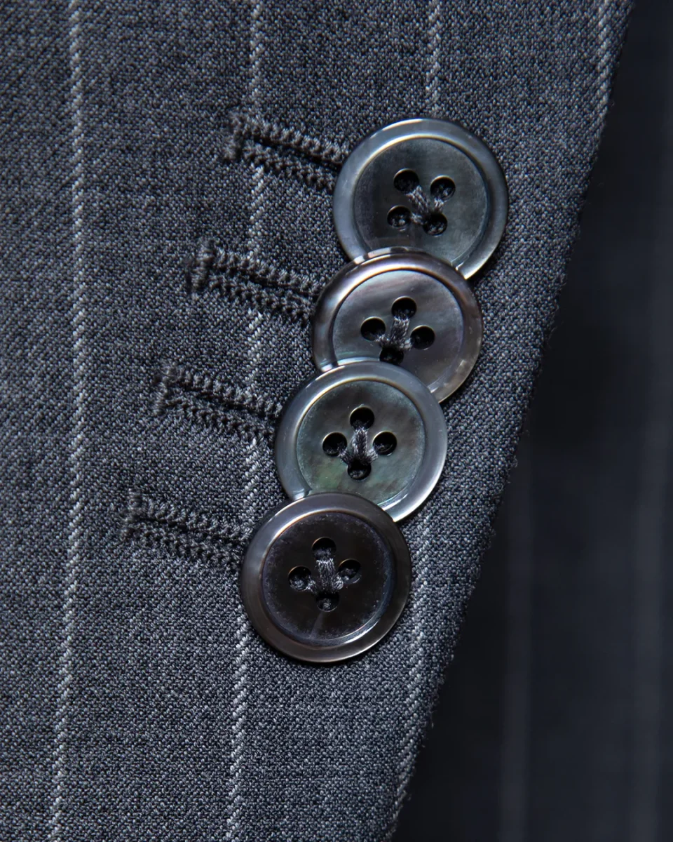 L’elemento distintivo del design è il rever a lancia, che conferisce alla giacca una postura decisa e dinamica. La scelta tecnica dell’abbottonatura singola esalta la pulizia del fronte, mentre le tasche a filetto si integrano perfettamente nella struttura, preservando la continuità visiva del pattern gessato e sottolineando il minimalismo sofisticato del modello.