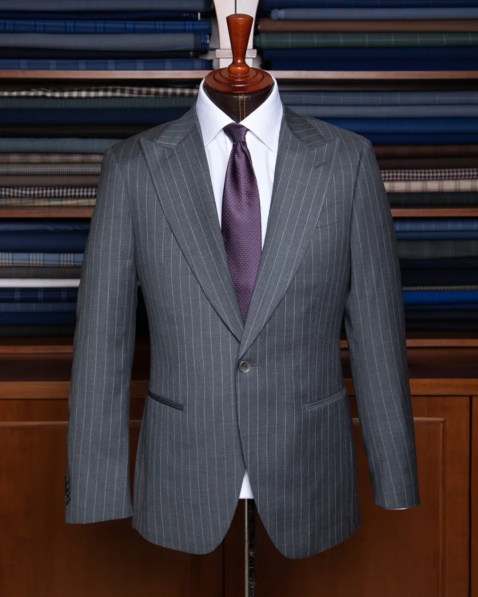 - Materiali: Pregiata lana grigio gessato dall’appiombo naturale e serico.