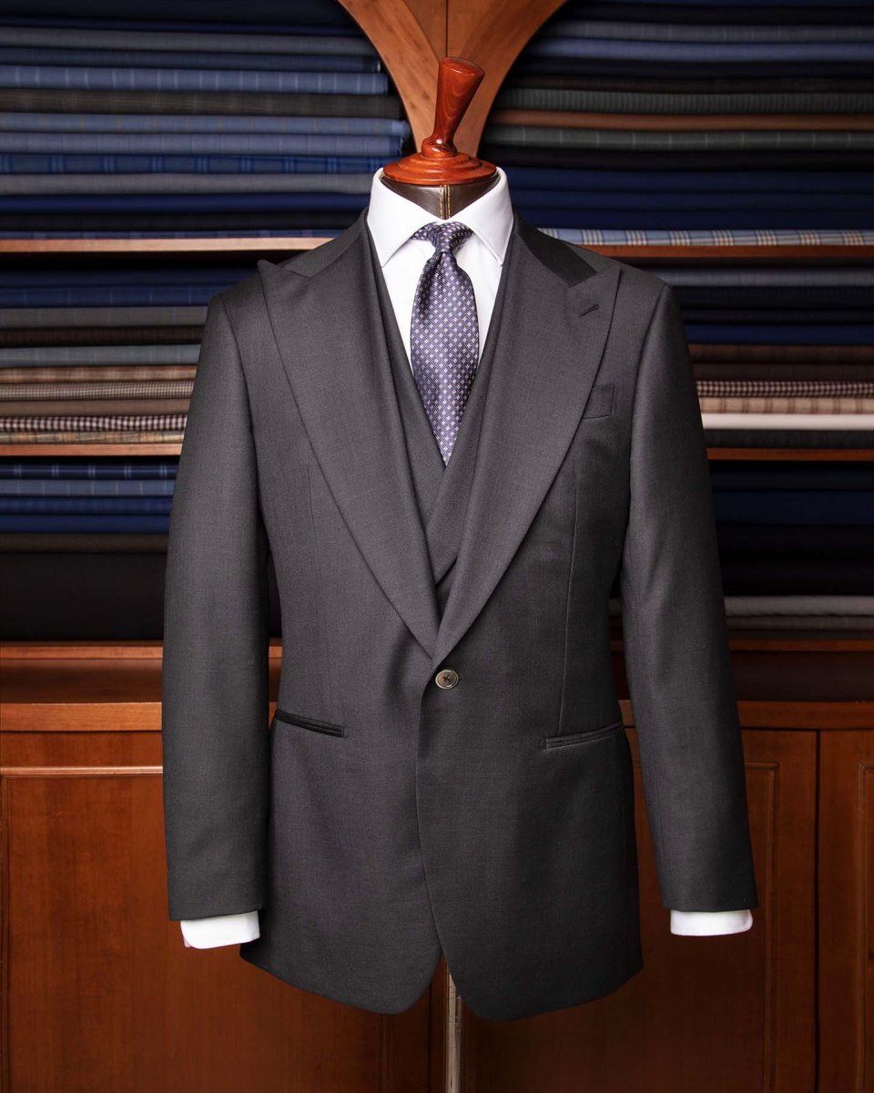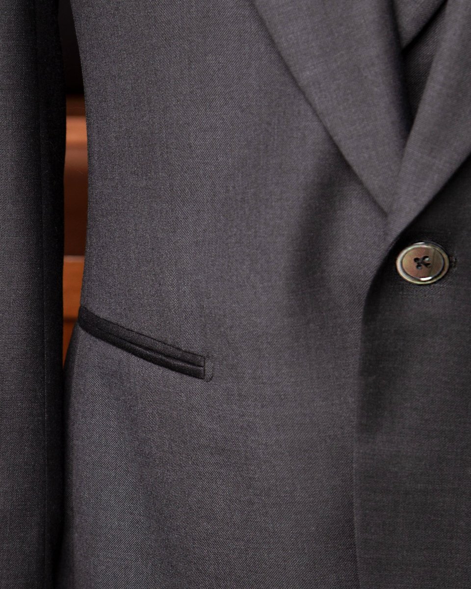 Il vero cuore pulsante di questa creazione risiede nell’anima interna: una fodera in cashmere blu. Questa scelta non è solo un dettaglio estetico, ma un’esperienza sensoriale che offre un calore nobile e una morbidezza ineguagliabile, trasformando la giacca in un guscio di puro comfort. I bottoni in madreperla antracite aggiungono un riflesso minerale che dialoga perfettamente con la profondità del grigio. Il focus del gilet risiede nel rever sciallato, una scelta che introduce una linea curva e sinuosa nel cuore dell’abito, creando un sofisticato contrasto con le punte decise del rever a lancia della giacca.