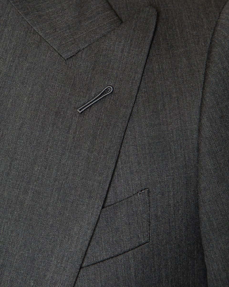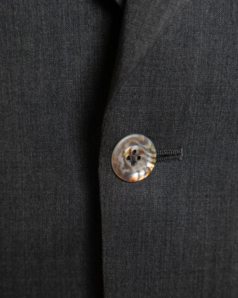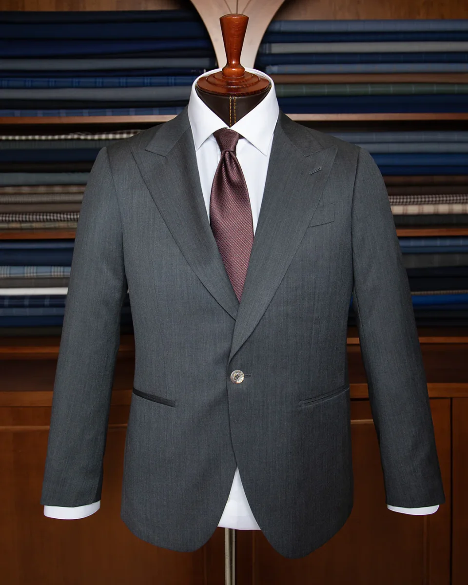 Il modello Modernico si distingue per un approccio minimalista e affilato. Il colore Grigio Ardesia, caratterizzato da quella particolare trama diagonale mélange che abbiamo visto nel tessuto, conferisce al capo una profondità materica unica, rendendolo meno severo di un grigio unito e molto più dinamico sotto la luce. La chiusura a un solo bottone enfatizza il taglio asciutto e moderno, mentre il rever a lancia aggiunge un tocco di audacia e formalità superiore, tipico degli abiti di alta rappresentanza.