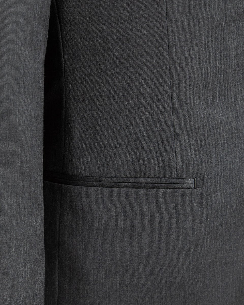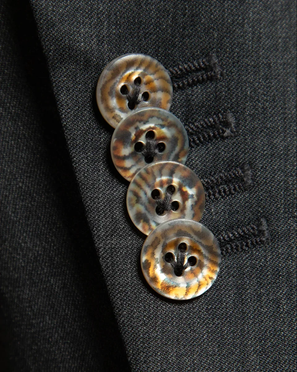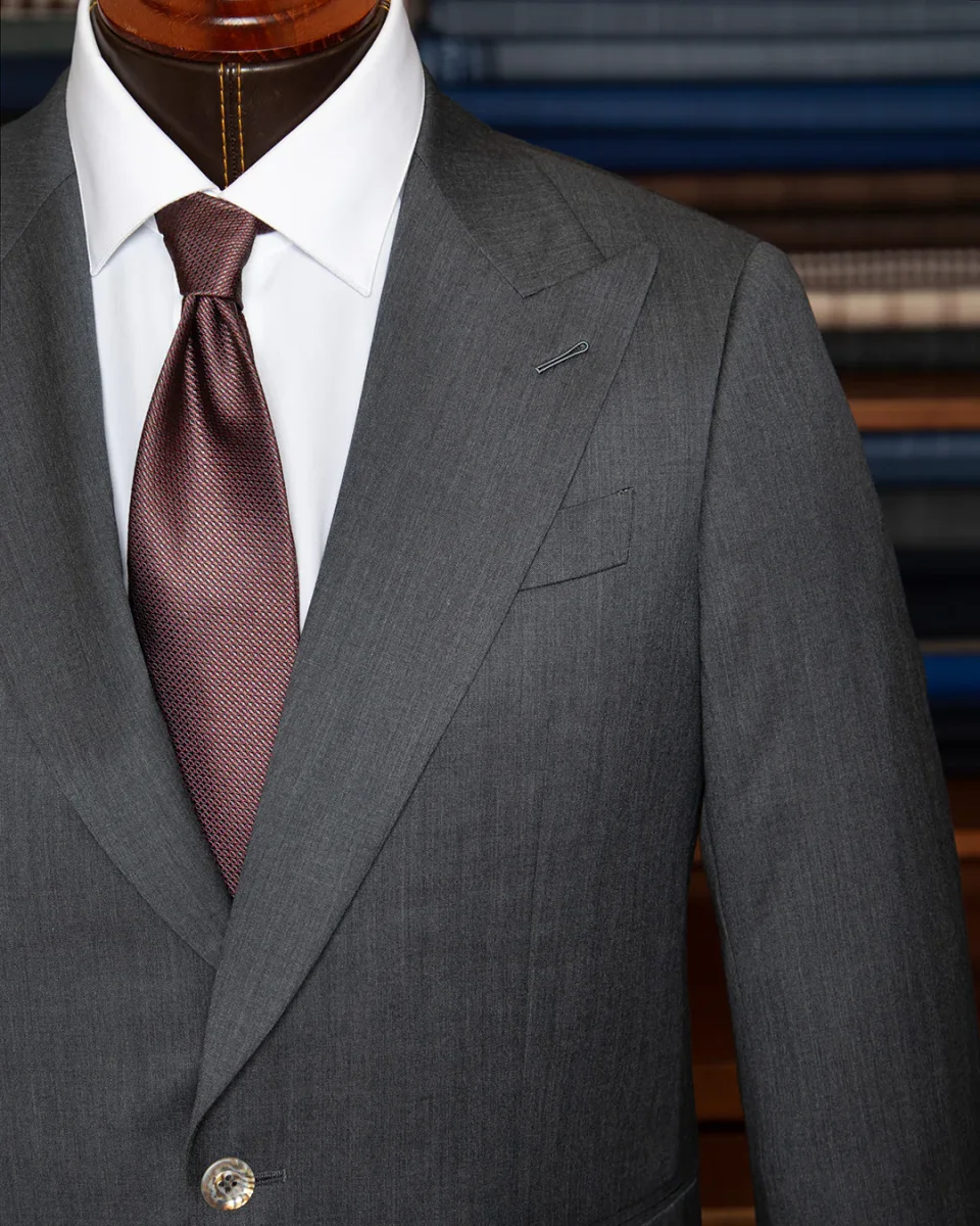 Il modello Modernico si distingue per un approccio minimalista e affilato. Il colore Grigio Ardesia, caratterizzato da quella particolare trama diagonale mélange che abbiamo visto nel tessuto, conferisce al capo una profondità materica unica, rendendolo meno severo di un grigio unito e molto più dinamico sotto la luce. La chiusura a un solo bottone enfatizza il taglio asciutto e moderno, mentre il rever a lancia aggiunge un tocco di audacia e formalità superiore, tipico degli abiti di alta rappresentanza.