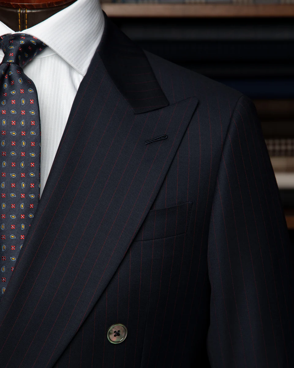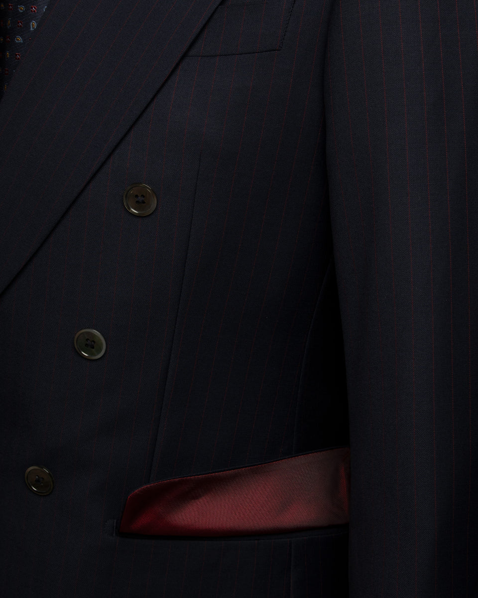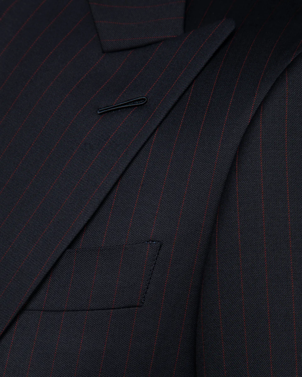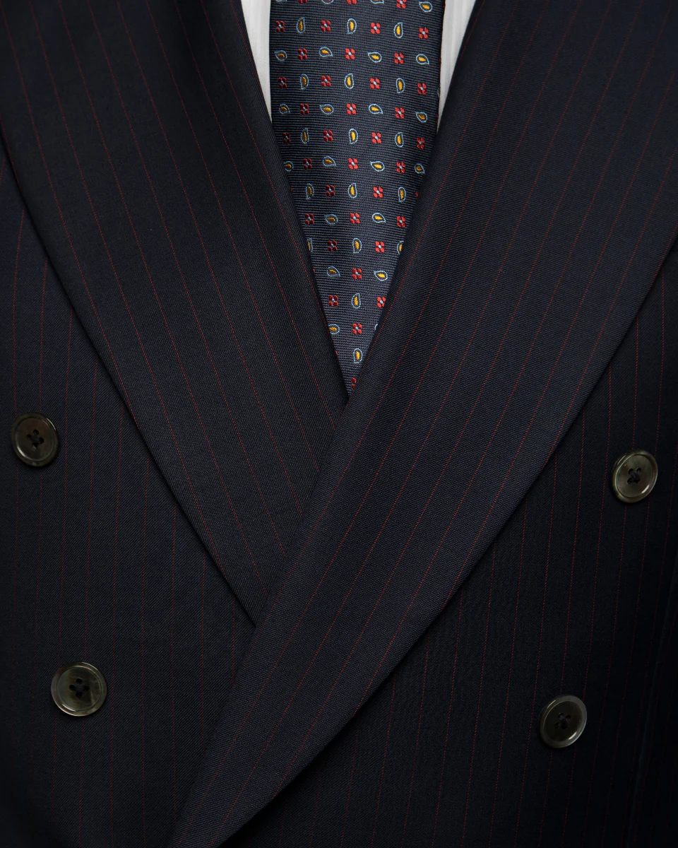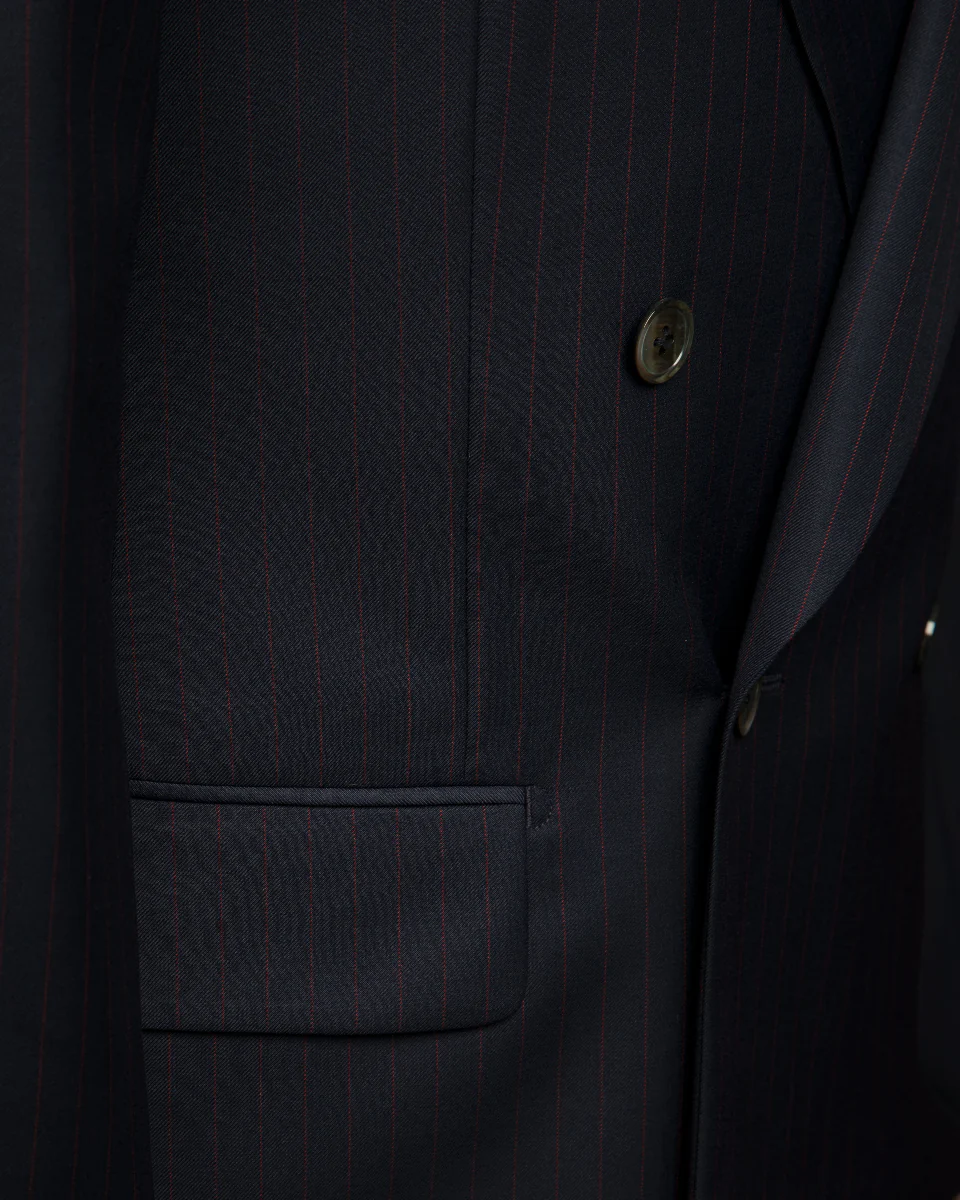 - Tessuto: 100% Lana blu notte di alta qualità, con una gessatura rossa definita che dona ritmo e carattere alla silhouette.