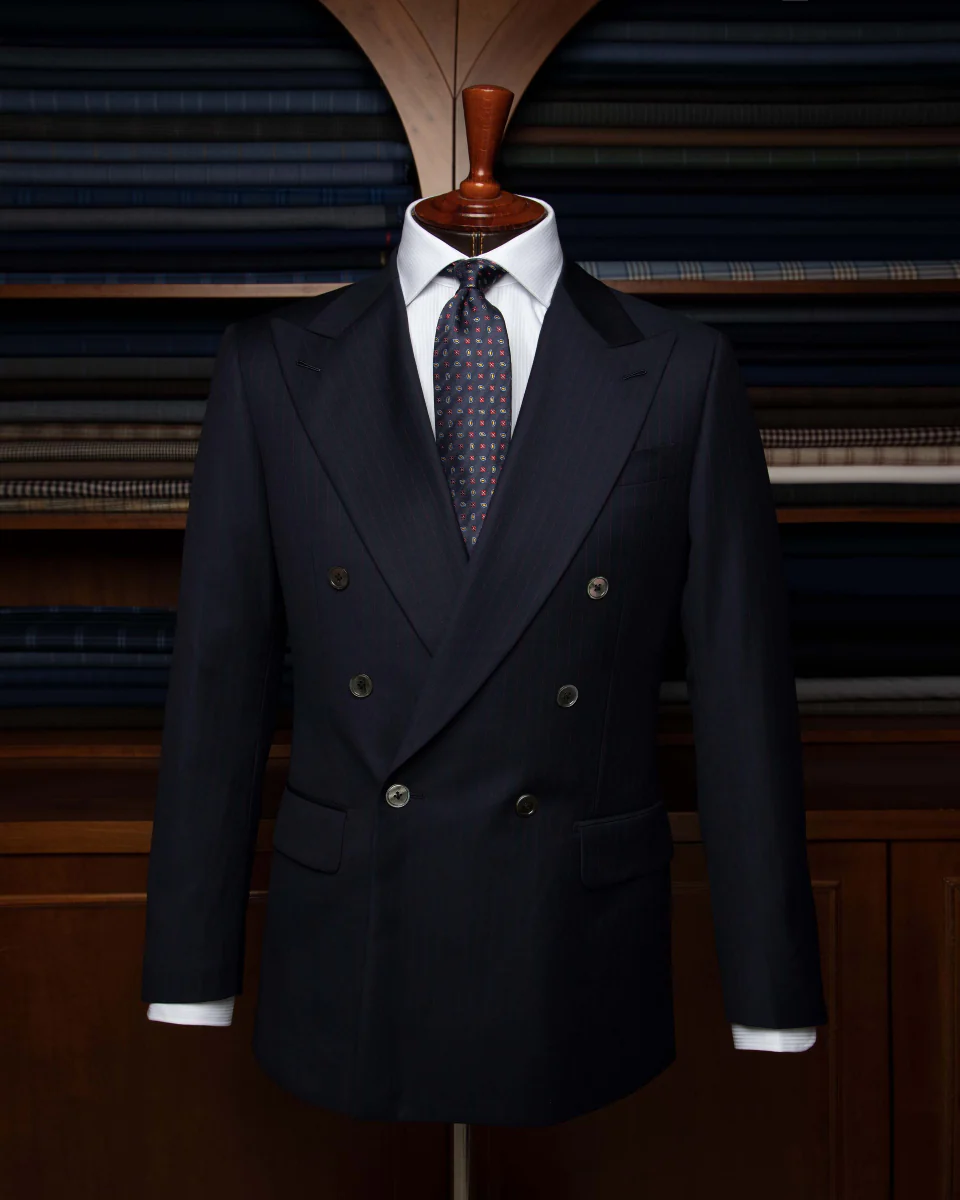 - Giacca: Modello doppiopetto 6×1 Perugino, una chiusura bassa che slancia il busto e conferisce un’estetica ricercata e potente.
