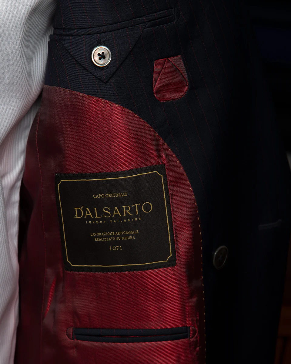 - Interno: Fodera Rossa, un dettaglio “bold” che richiama la gessatura esterna e firma il capo con un tocco di esclusività.