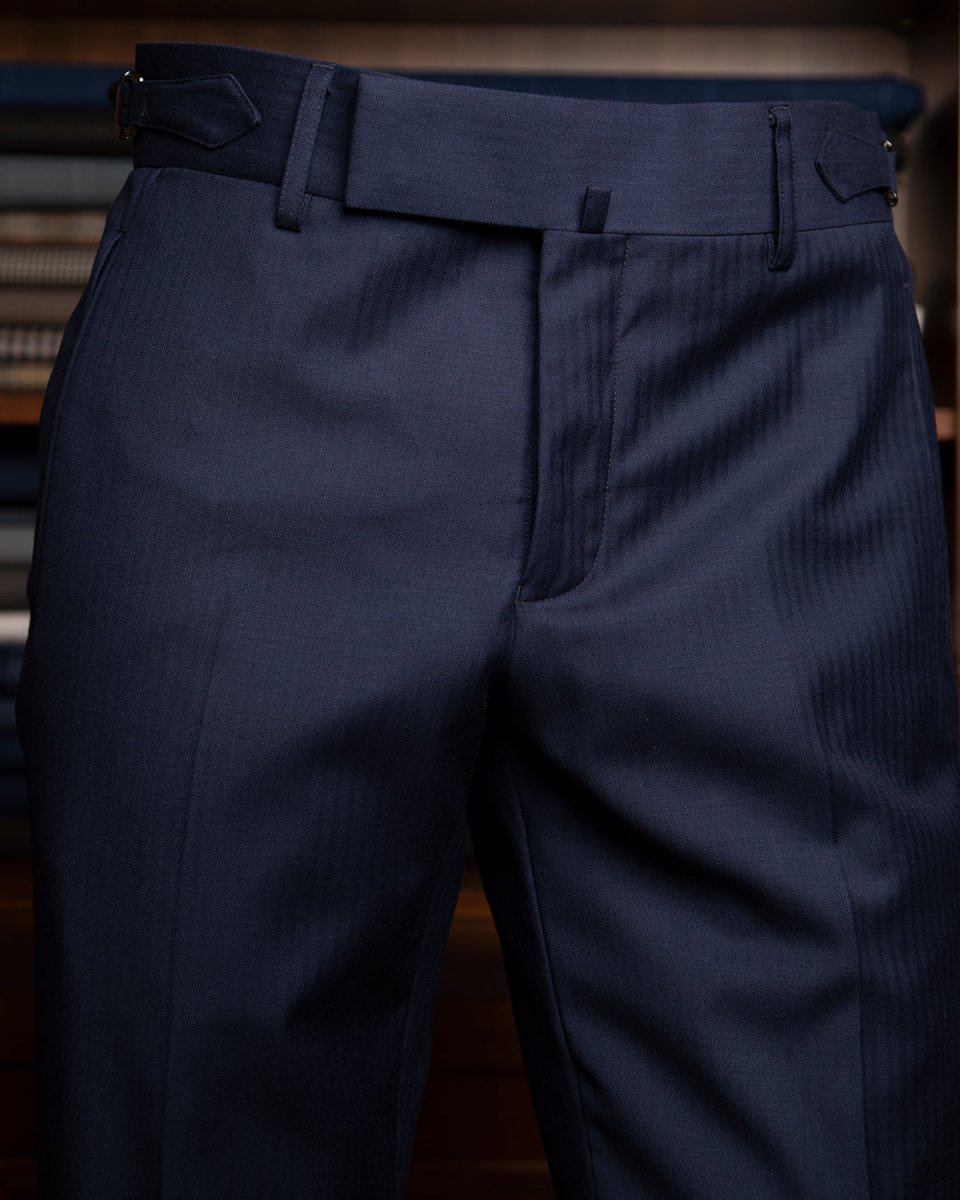 Il pantalone accompagna la giacca con una coerenza strutturale assoluta. Il taglio è rigorosamente privo di pinces per preservare la continuità del motivo spinato, mentre l’assenza di passanti è compensata dai tirantini laterali. Questa soluzione tecnica, emblema della sartoria d’élite, permette un fitting millimetrico e garantisce una silhouette continua, tipica della più alta ingegneria sartoriale.